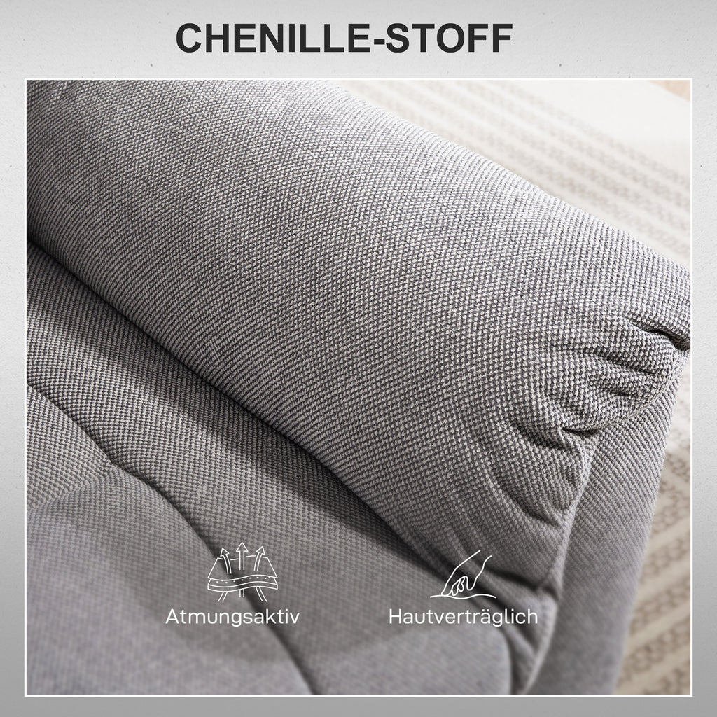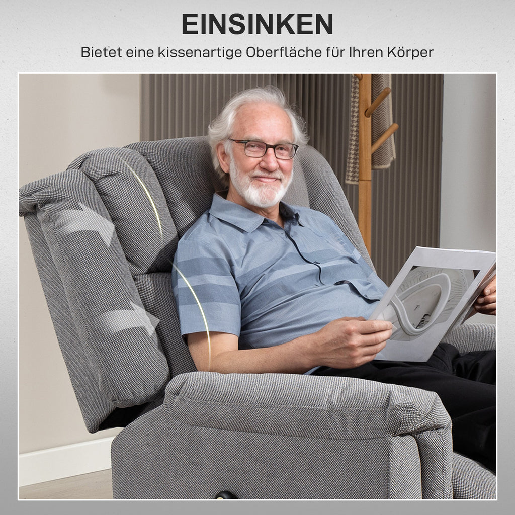 Erleben Sie den mühelosen Wechsel vom Sitzen zum Stehen mit dem HOMCOM Relaxsessel, der Ihre Autonomie täglich fördert. Genießen Sie das Verschwinden der Anspannung durch seine wohltuende Massage und Wärmefunktion, die Ihnen Zuhause eine Spa-Atmosphäre schaffen. In weiches Chenille gehüllt, ergänzt dieser TV Sessel Ihr Dekor und bietet gleichzeitig eine behagliche Umarmung, die Ihre Wohnqualität steigert.