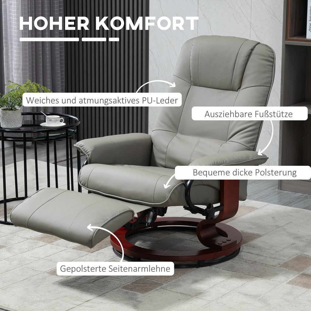 Entspannen Sie sich nach einem anstrengenden Tag mit dem HOMCOM Relaxsessel. Dank des 360°-Drehfußes genießen Sie volle Bewegungsfreiheit, während die robuste Holzkonstruktion für Stabilität sorgt. Die vollständige Polsterung bietet ultimativen Komfort, und die verstellbare Rückenlehne sowie der manuelle Fußstütze garantieren absolute Entspannung. Mit seinem eleganten Kunstlederbezug vereint dieser Kinosessel Schönheit und Stil auf perfekte Weise. Gönnen Sie sich den Luxus, den Sie verdienen.