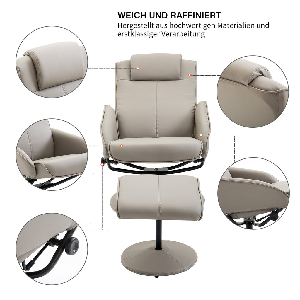 Ergonomisch geformt, schlicht im Design und einfach bequem. Mit unserem grauen Relaxsessel genießen Sie Ihren Feierabend gänzlich entspannt. Ihr Sessel kommt mit einem komfortablen Fußhocker, sodass Sie einfach die Beine hochlegen und sich zurücklehnen können. So verbringen Sie gemütliche Stunden vor dem Fernseher, beim Lesen oder Musikhören. Die neigbare Rückenlehne ist ergonomisch und unterstützt Ihren Rücken auch bei längerem Sitzen. Gehalten wird Ihr Fernsehsessel von einem soliden Stahlrahmen. Die Polsterung ist aus weichem Schwamm, darüber spannt sich der strapazierfähige graue Kunstlederbezug. So genießen Sie einen erholsamen Feierabend.