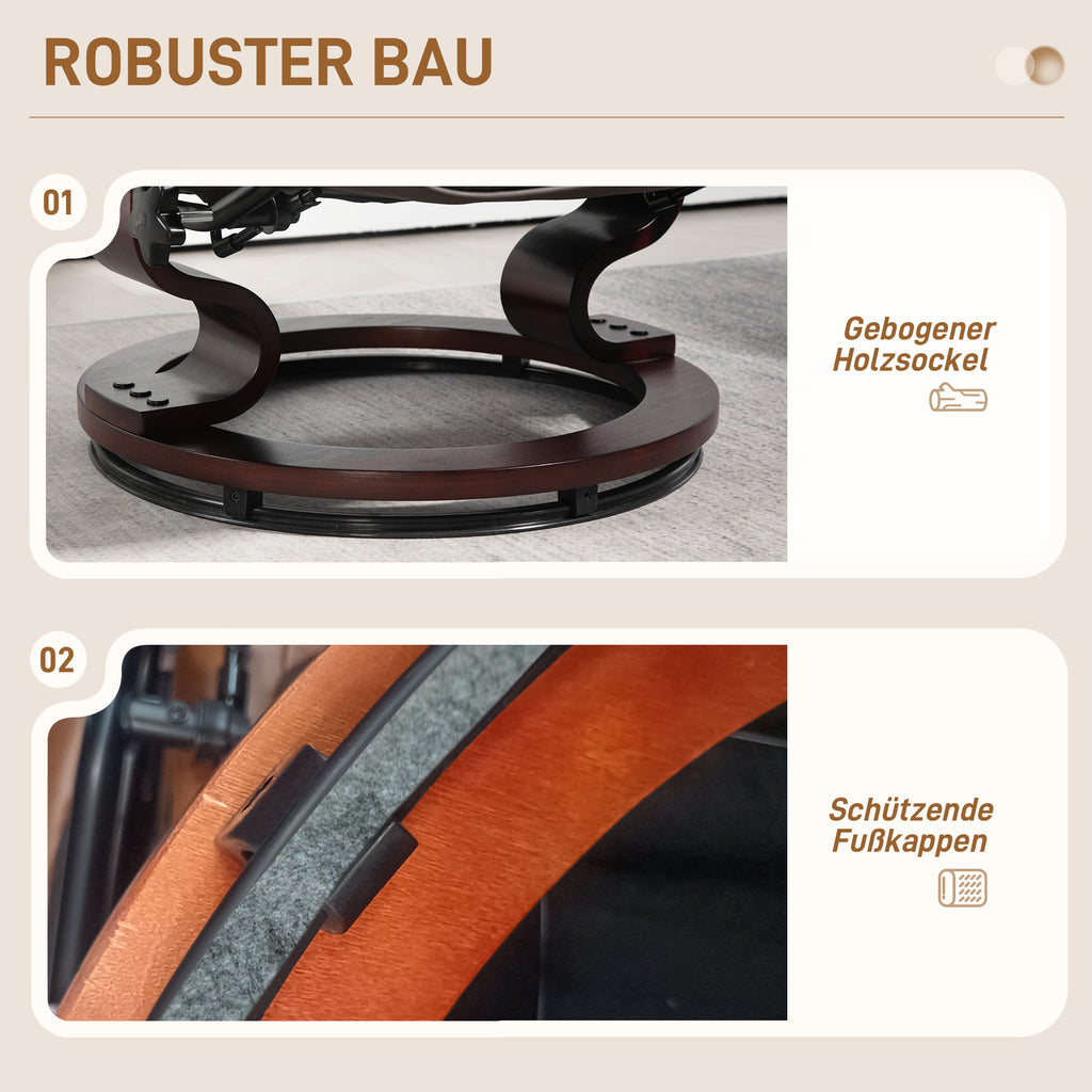 Entspannen Sie stilvoll mit dem Relaxsessel mit Hocker von HOMCOM, Ihrem neuen Partnerduo für ultimative Erholung! Lehnen Sie sich bis zu 130° zurück und genießen Sie die Bewegungsfreiheit einer 360° drehbaren Basis sowie einer Schaukelfunktion. Gönnen Sie sich den Luxus unseres HOMCOM TV-Sessels, umhüllt von elegantem Kunstleder und eingebettet in einen stabilen Rahmen aus gebogenem Holz. Ideal fürs Wohnzimmer oder als stilvolle Ergänzung für Ihre Leseecke.
