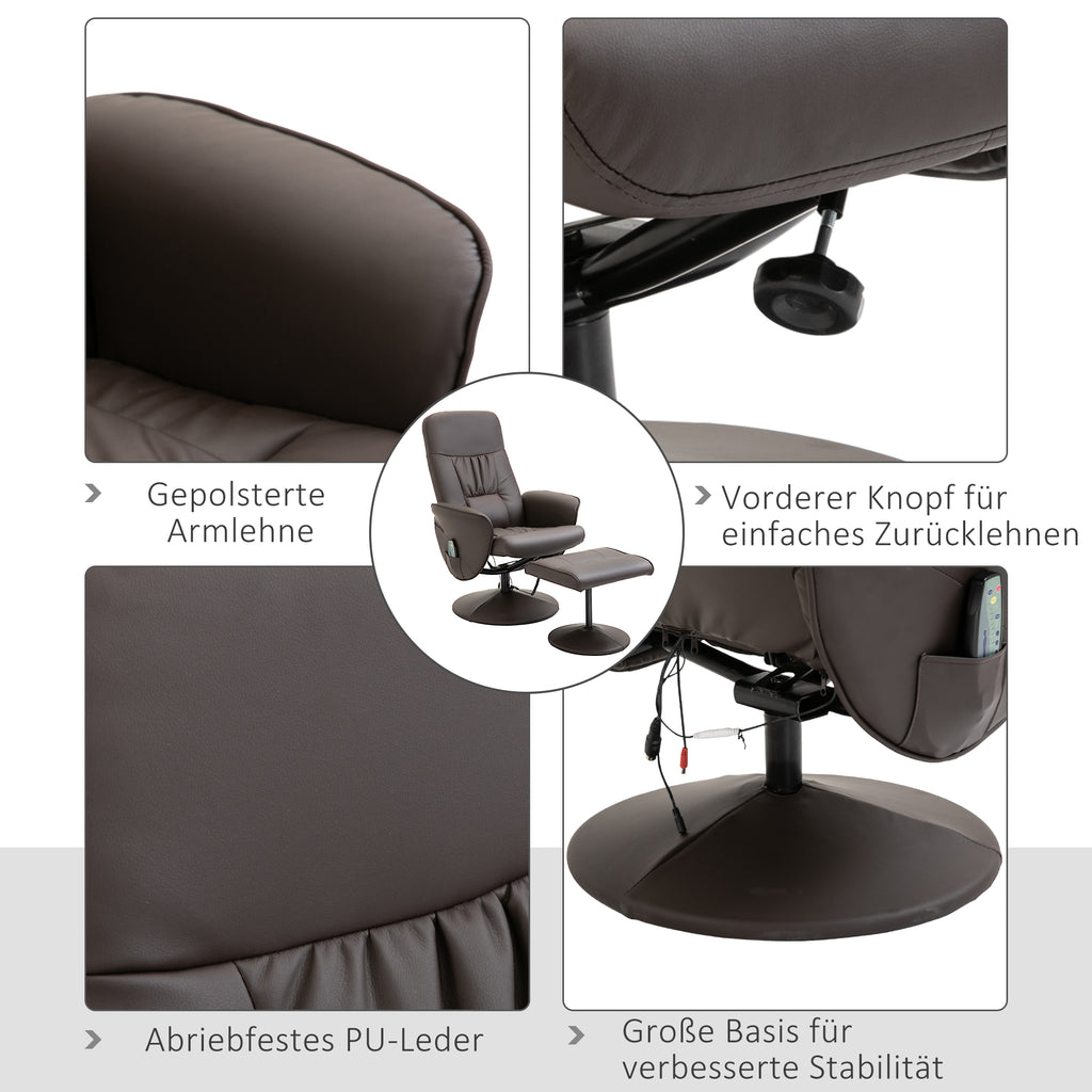 In diesem HOMCOM Relaxsessel vergessen Sie den Stress des Alltags schnell. Dank seiner zehn Massagepunkte (per Fernbedienung regulierbar) entspannen Sie Ihren gesamten Körper. Der Neigungswinkel des Kinosessels beträgt bis zu 145°. Rückenlehne, Sitzkissen, Armlehnen und der Fußhocker sind mit hochdichtem Schaumstoff gepolstert – ideal für einen angenehmen Abend, ganz gleich, ob Sie fernsehen, ein Buch lesen oder ein Nickerchen machen.