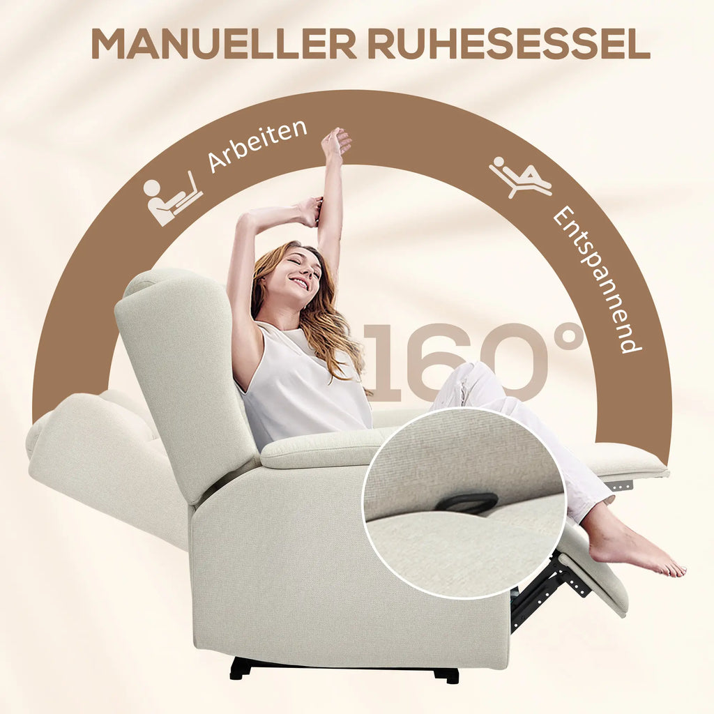 Entspannen Sie sich in dem luxuriösen HOMCOM Relaxsessel mit einer 160° verstellbaren Rückenlehne, für ideale Erholung. Die Fußstütze können Sie nach einem anstrengenden Tag einfach mit den Fersen ein- und ausklappen. Die Taschenfederpolsterung des Sessels mit Liegefunktion, bezogen mit weichem Stoff, verleiht jedem Raum moderne Eleganz und garantiert flexible Unterstützung durch die üppige Füllung und das stilvolle Design.