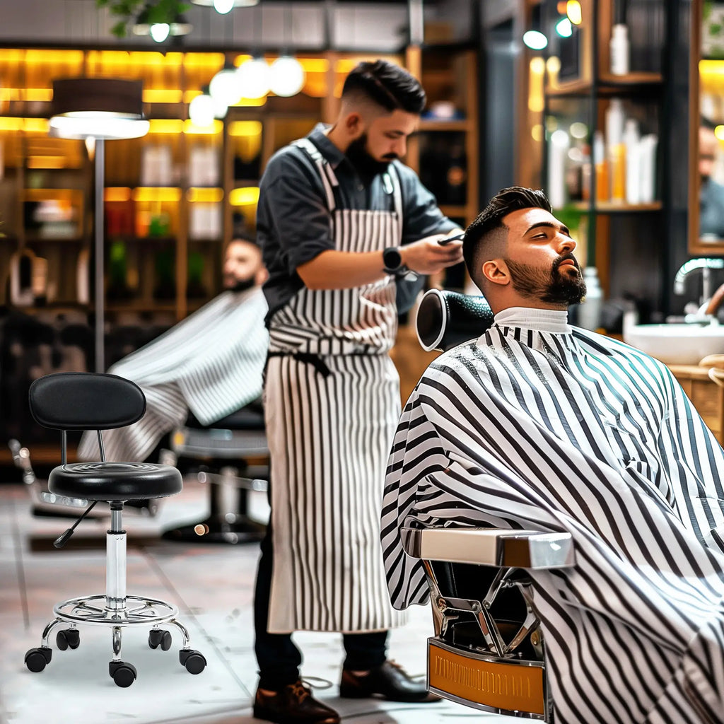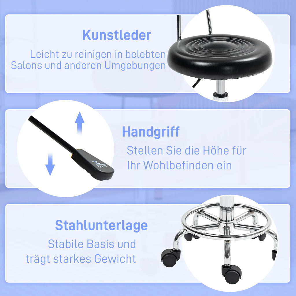 Entdecken Sie den HOMCOM Rollhocker, Ihren neuen Favoriten unter den Salonstühlen! Er bietet einen mit Schaumstoff gepolsterten Sitz und eine Rückenlehne, die ganztägigen Komfort garantieren. Dank der 360-Grad-Drehmöglichkeit und den sanft gleitenden Rollen ist er spielend leicht zu manövrieren. Perfekt als Stuhl für Schminktische oder als Friseurstuhl, dieses praktische Möbelstück ist vielseitig einsetzbar.