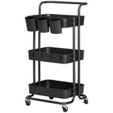 Dieser Rollwagen ist kompakt und ideal für kleine Räume, die zusätzlichen Stauraum benötigen. Die drei Ablagekörbe, drei abnehmbare Hängeboxen und vier abnehmbare Haken bieten ausreichend Platz für verschiedenste Dinge. Die leichtgängigen Räder ermöglichen es Ihnen, den Servierwagen dorthin zu bewegen, wo er am dringendsten benötigt wird. Er eignet sich gut als Servierwagen für Kunstutensilien, Küchenwagen mit Stauraum, Beistelltisch im Wohnzimmer und Rollregal für die Werkstatt.