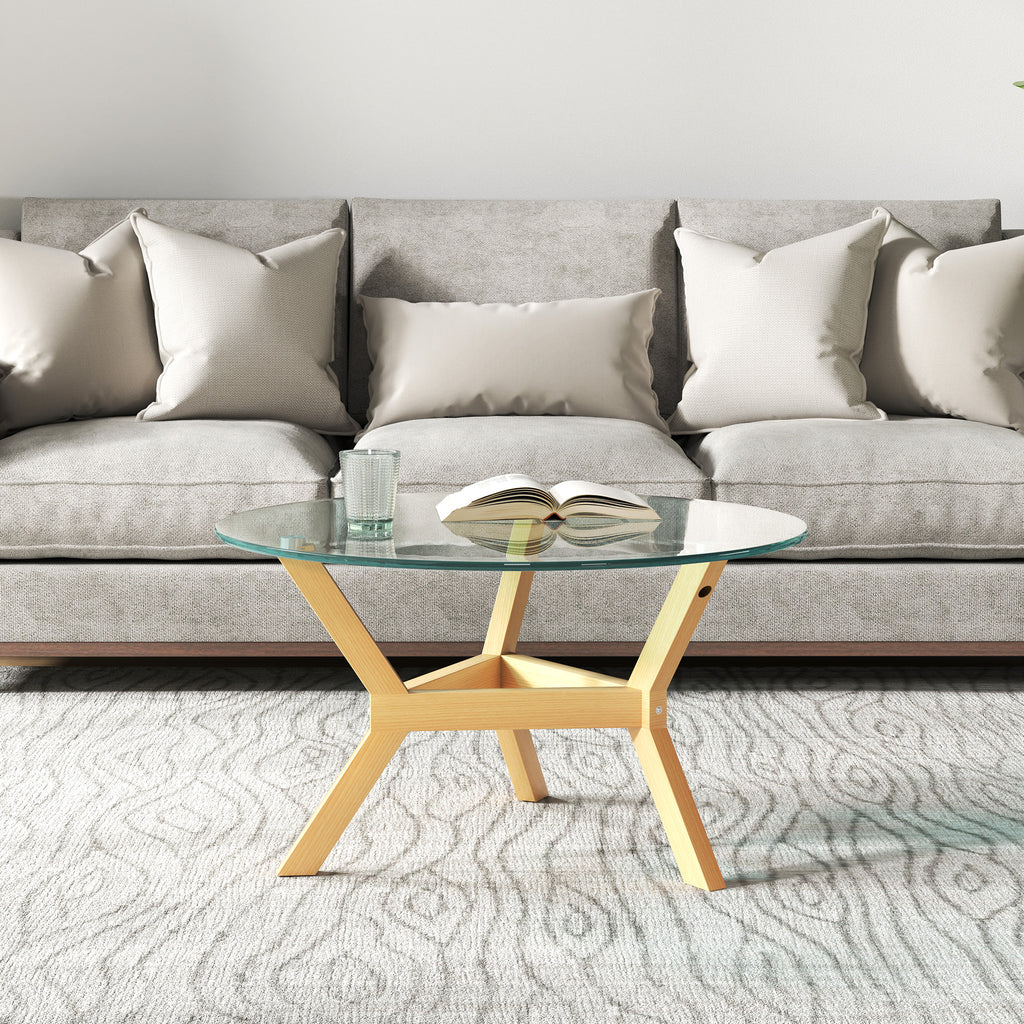 • Gehärtetes Glas: Aus hochwertigem gehärtetem Glas gefertigt, zeichnet sich dieser runde Wohnzimmertisch durch seine Langlebigkeit und Stoßfestigkeit aus, was ihn zu einem robusten und pflegeleichten Möbelstück macht.
