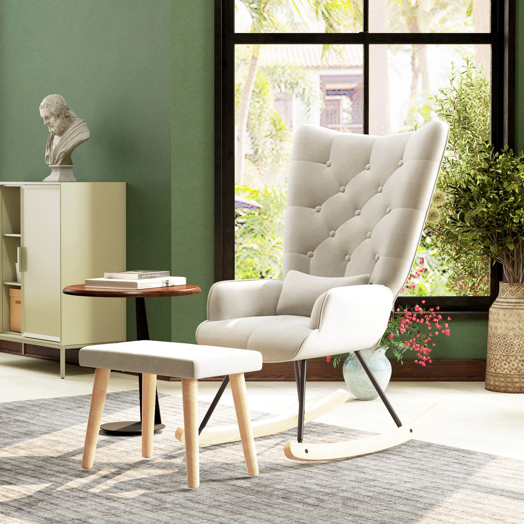 Doppelte Entspannung im doppelten Stil: Das HOMCOM-Set mit einem großzügigen Schaukelstuhl und passendem Hocker lädt zum Relaxen ein. Mit seiner modernen Form und der großzügigen Sitzfläche bietet der Stillstuhl optimalen Komfort und Halt durch die hohe Rückenlehne. Der Lesestuhl mit samtiger Polsterung und schlanken Beinen verleiht ihm ein luxuriöses Aussehen.