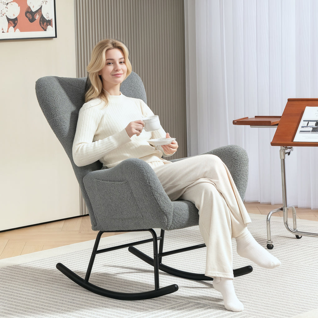 Genießen Sie himmlischen Komfort mit dem Schaukelstuhl vom HOMCOM. Schaukeln Sie zwischen 90° und 115°, um die perfekte Position zu finden. Der Bezug aus weichem Teddystoff, das Kissen und die mit dichtem Schaumstoff gepolsterte Rückenlehne bieten ideale Erholung, getragen von einem robusten Metallgestell. Die praktische Seitentasche bewahrt Bücher oder die Fernbedienung auf, für eine aufgeräumte Umgebung. Ideal als gelegentlicher Sitz und funktionaler Schaukelsessel für Erwachsene.
