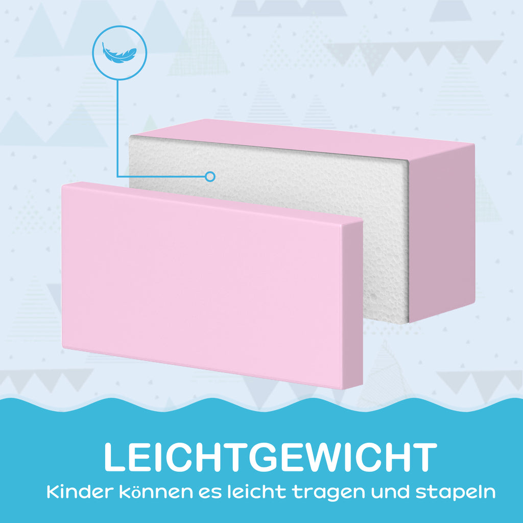 - Das weiche Softbaustein Set enthält drei Quader, eine Rampe, ein Wellen-Element, einen Viertelzylinder und einen Zylinder