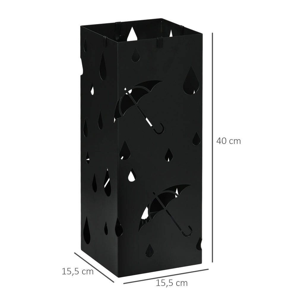 Regnerische Tage erfordern Regenschirme, die oft nasse Böden hinterlassen. Der stilvolle und funktionale HOMCOM Regenschirmständer für den Flur schafft einen speziellen Aufbewahrungsort für Regenschirme. Aus robustem, verzinktem Stahl gefertigt, ist der Schirmständer widerstandsfähig gegen Rost. Mit seinen Maßen von 15,5 x 15,5 cm fasst er zwei große Schirme und bietet vier Haken für kleinere. Inklusive einer abnehmbaren Bodenschale zum einfachen Entfernen von Flüssigkeit.
