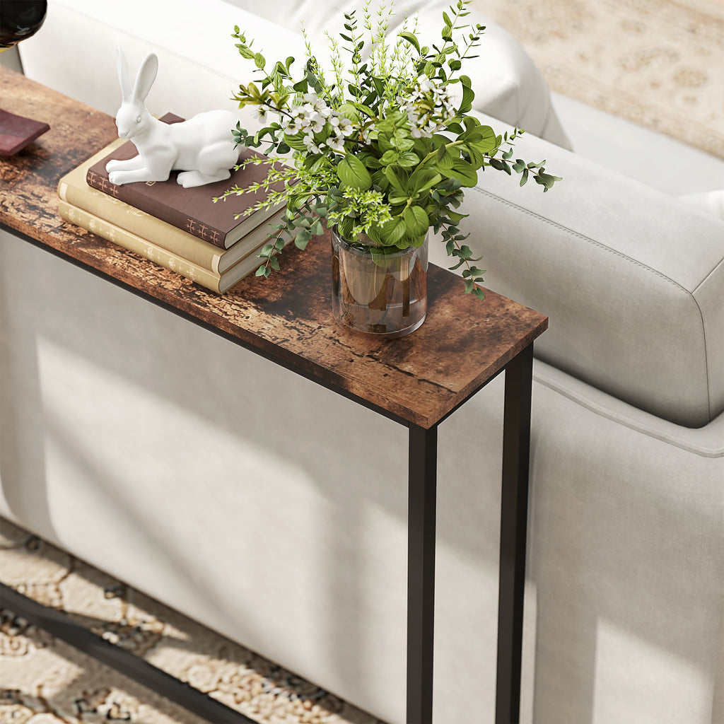 Entdecken Sie die praktische schmale Konsole von HOMCOM, ideal, um kleine Räume aufgeräumt zu gestalten. Ausgestattet mit zwei AC Steckdosen sowie USB- und USB-C-Ports, perfekt zum bequemen Aufladen Ihrer Geräte. Das schlanke Design fügt sich nahtlos hinter das Sofa ein und die Kombination aus rustikalen braunen Paneelen und schwarzem Stahlrahmen verleiht Ihrem Wohnzimmer und Flur einen industriellen Charme.