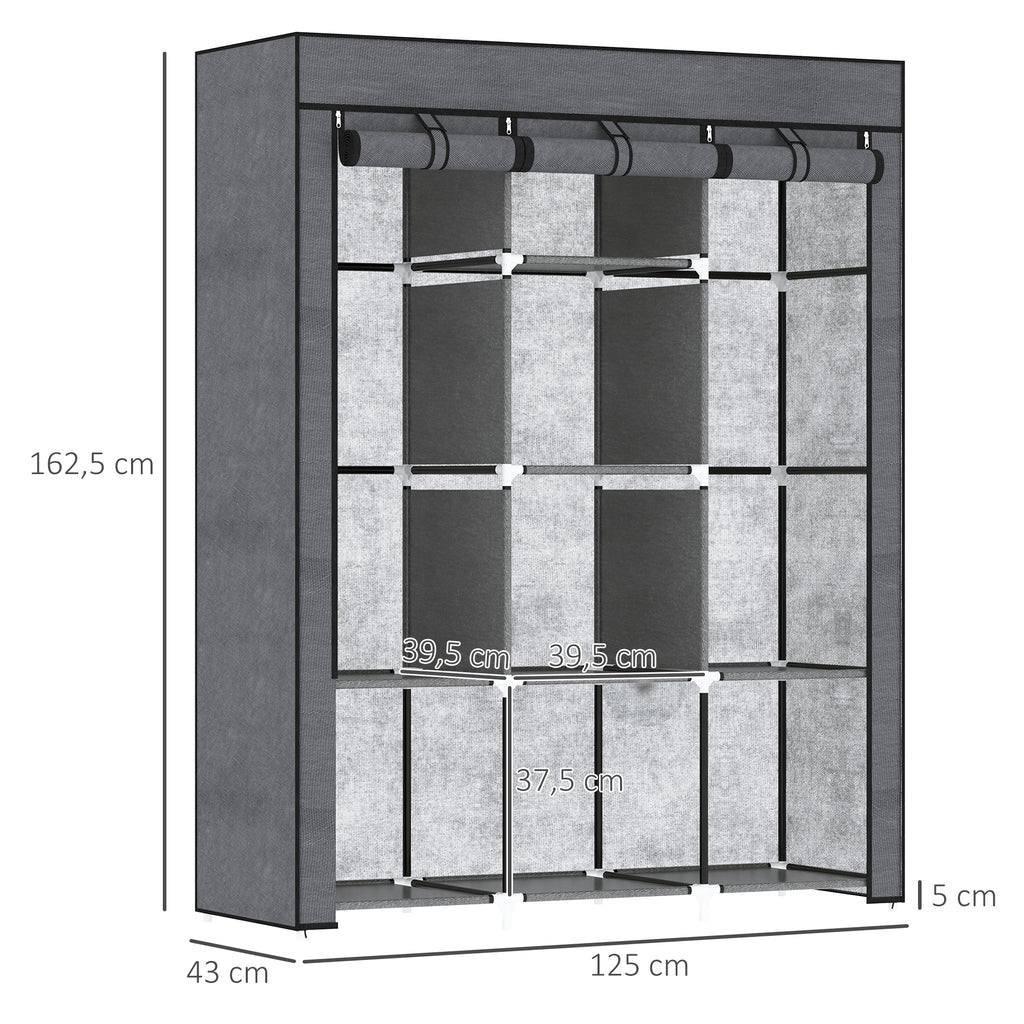 Mit diesem Kleiderschrank aus Stoff von HOMCOM wird Ordnung in Ihrem Zuhause herrschen. Dank seines vielseitigen Designs eignet sich dieser Schrank ideal für jedes Zimmer in Ihrem Zuhause, das zusätzlichen Stauraum benötigt. Er verfügt über 2 Kleiderstangen und 8 Einlegeböden, um Ihre Kleidung, Handtücher, Bettwäsche oder Taschen zu organisieren und aufzubewahren. Der Bezug aus Vliesstoff ist perfekt, um Ihre Sachen vor Staub zu schützen - die ideale Organisationslösung!
