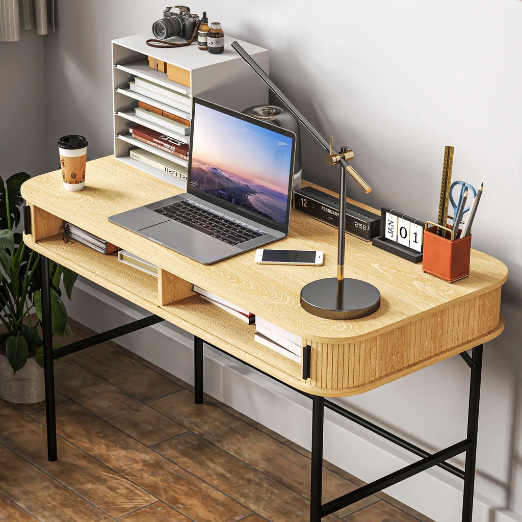 Steigern Sie Ihre Produktivität mit dem HOMCOM Schreibtisch, der zeitlosen Mid-Century-Ästhetik und modernem Flair vereint. Der auffällige Eichenfarbton und der elegante schwarze Kontrast des Computertisches schaffen eine inspirierende Arbeitsumgebung. Nutzen Sie die großzügige Tischplatte des Bürotisches für all Ihre kreativen Projekte, während der stilvolle Lamellendekor zwei praktische Fächer versteckt, um Utensilien geschickt zu verbergen. Eine perfekte Symbiose aus Form und Funktion!