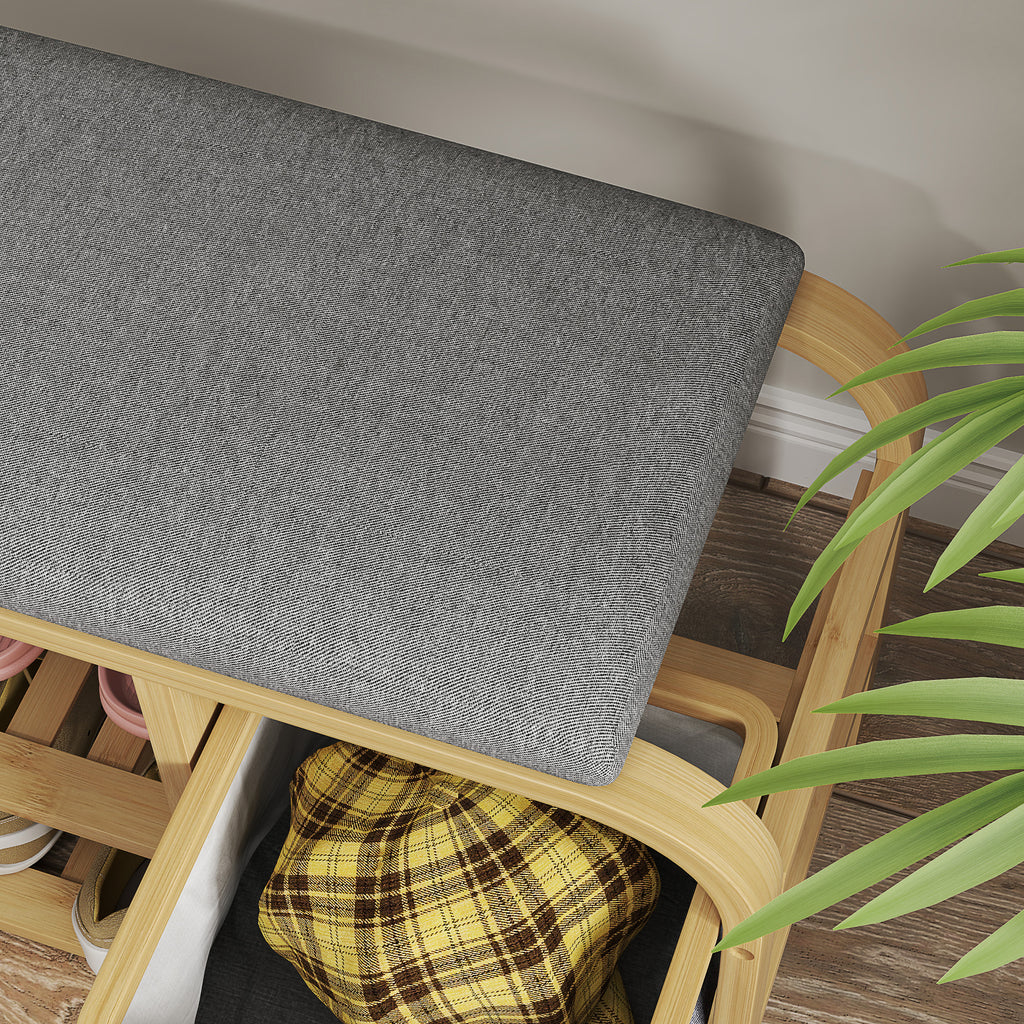 Verleihen Sie Ihrem Flur mit der Bambus-Schuhablage von HOMCOM einen neuen Look, wo Design auf praktischen Nutzen trifft. Der Komfort eines weichen, leinenähnlichen Kissens erwartet Sie, während Sie bis zu fünf Paar Schuhe übersichtlich verstauen. Kleinere Artikel griffbereit? Der ausziehbare Stoffkorb ist perfekt und fügt sich nahtlos in das elegante Design des lackierten Bambusgestells ein.