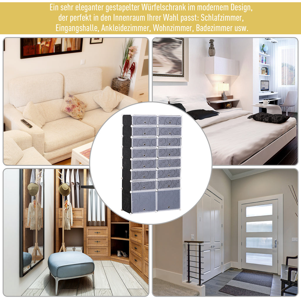 Der Aufbau dieses modularen Schranks von HOMCOM ist nicht nur einfach und praktisch, sondern macht sogar Spaß! Lassen Sie Ihrer Fantasie freien Lauf und passen Sie den Schrank perfekt an Ihre Räumlichkeiten an – selbst unter der Treppe oder in schmalen Nischen können Sie Ihren Schuhschrank dank des flexiblen Stecksystems unterbringen. Die Kunststoffpaneele und der pulverbeschichtete Metallrahmen sind langlebig und besonders pflegeleicht. Hier findet alles seinen Platz und dank der halbdurchsichtigen weißen Türen finden Sie es auch schnell wieder. Ob als Schuhschrank, Raumteiler oder universelle Aufbewahrung – dieses Schranksystem mit seinem schicken schwarz-weißen Design und hübschen Muster ist die elegante Lösung für Ihren Stauraum.
