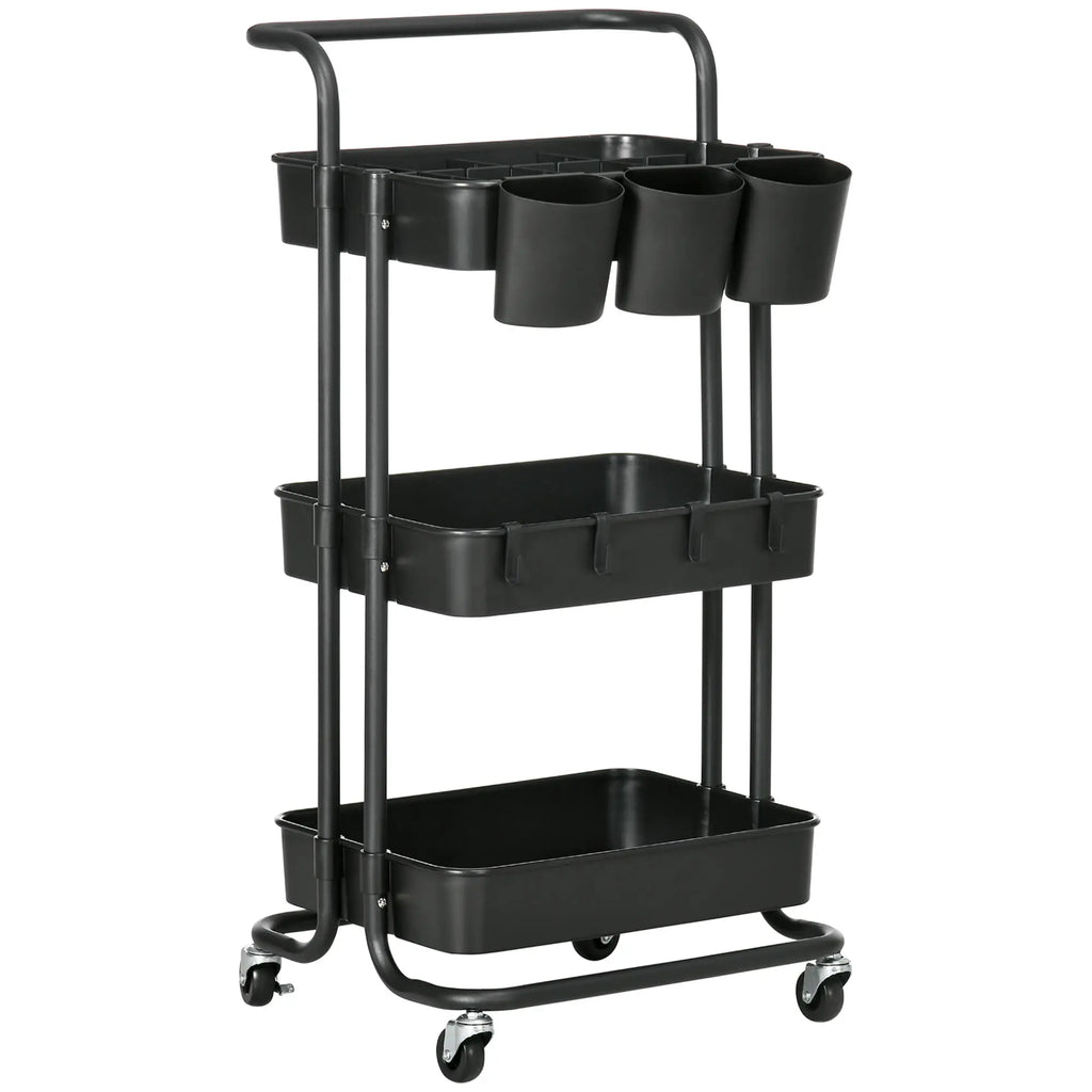 Dieser Rollwagen ist kompakt und ideal für kleine Räume, die zusätzlichen Stauraum benötigen. Die drei Ablagekörbe, drei abnehmbare Hängeboxen und vier abnehmbare Haken bieten ausreichend Platz für verschiedenste Dinge. Die leichtgängigen Räder ermöglichen es Ihnen, den Servierwagen dorthin zu bewegen, wo er am dringendsten benötigt wird. Er eignet sich gut als Servierwagen für Kunstutensilien, Küchenwagen mit Stauraum, Beistelltisch im Wohnzimmer und Rollregal für die Werkstatt.