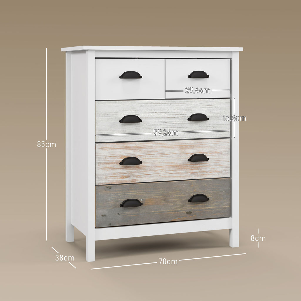 Erwecken Sie Ihr Zuhause mit dieser unwiderstehlich charmanten HOMCOM Kommode zum Leben! Das schicke Design des Schubladenschranks in zeitlosen Farben fügt sich nahtlos in Ihr Dekor ein und bietet großzügigen Stauraum mit drei großen und zwei kleinen Schubladen. Halten Sie Ihre Kleidung, Bücher und Brettspiele ordentlich verstaut, während Sie gleichzeitig den vorhandenen Platz perfekt ausnutzen - eine geschmackvolle und stilsichere Kombination aus Ästhetik und Funktion!