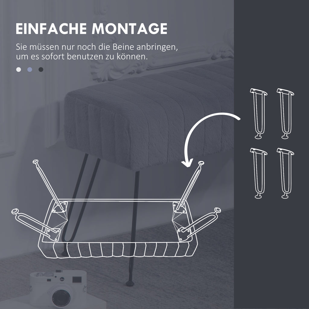 Bei dieser HOMCOM Sitzbank trifft elegantes Design auf höchsten Komfort. Dieser 82 cm breite Sitz ist mit Kunstfell bezogen und mit großzügig gepolstert, um unvergleichlichen Komfort zu bieten. Kombiniert mit schlanken, schwarzen Metallbeinen, ist diese Flurbank eine stilvolle Ergänzung für jeden Raum und bereichert Ihr Zuhause mit einem Hauch von geschmackvoller Raffinesse. Ideal als Schuhbank in Ihrem Eingangsbereich, als Bettbank im Schlafzimmer oder als Sitzbank im Wohnzimmer.