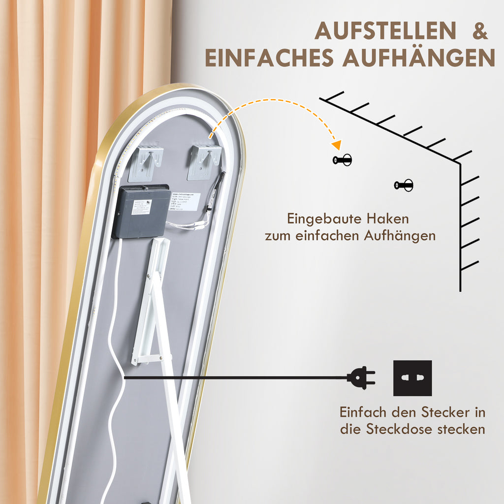 Der HOMCOM Standspiegel mit Licht präsentiert Ihre Schönheit von Kopf bis Fuß. Per Knopfdruck passen Sie die Lichtfarbe und -intensität an verschiedene Szenarien an. Dank des klappbaren Standfußes und der mitgelieferten Wandhalterung kann dieser hohe Spiegel für das Schlafzimmer als freistehender Spiegel, als Wandspiegel oder als anlehnender Spiegel verwendet werden - so können Sie ihn überall aufstellen, wo Sie möchten. Bringen Sie Licht in Ihr Zuhause mit unserem HOMCOM Ganzkörperspiegel.