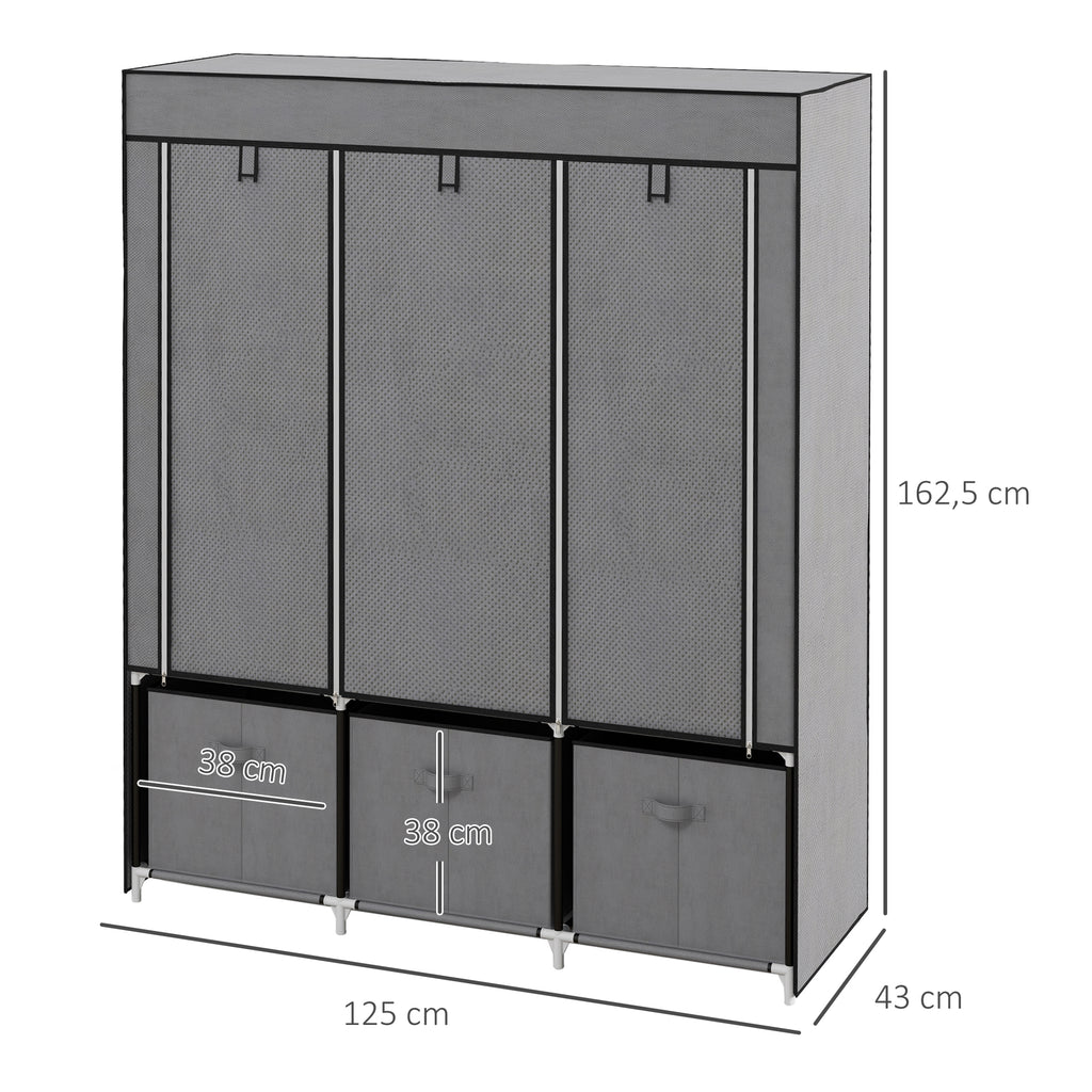 Mit diesem faltbaren Kleiderschrank aus Stoff von HOMCOM können Sie die Einfachheit in Ihrem Schlafzimmer in den Vordergrund stellen. Dank seiner praktischen und platzsparenden Eigenschaften können Sie den Schrank in Ihrem Schlafzimmer, Wohnzimmer oder an einem anderen Ort aufstellen. 5 offene Einlegeböden, 3 große Schubladen und 2 Hängeflächen bieten viel Platz für Ihre Kleidung. Der Bezug aus Vliesstoff hält Ihre Sachen staubfrei.