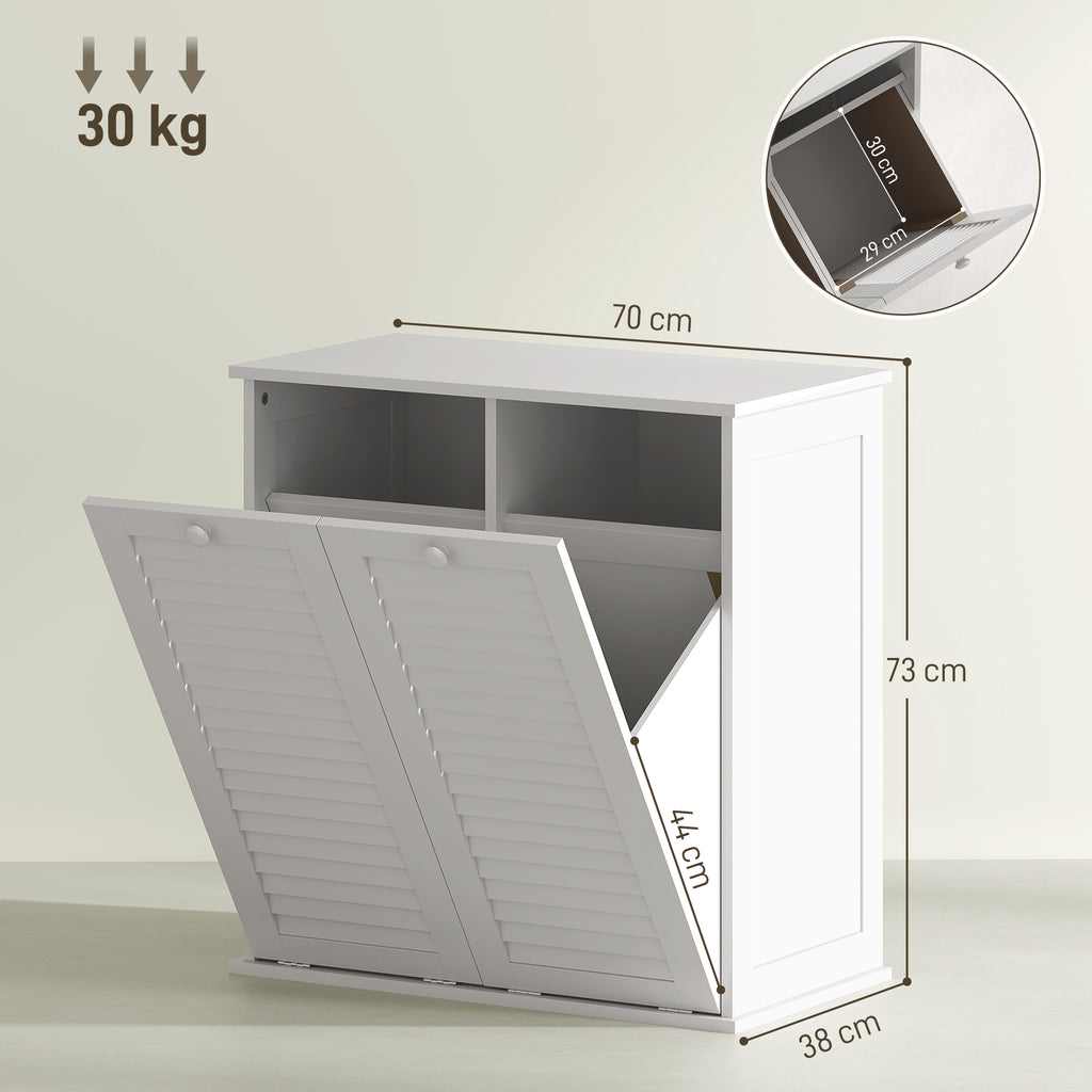 Verwandeln Sie Ihr Badezimmer mit dem HOMCOM Wäscheschrank in eine stilvolle Oase der Ordnung. Die zwei praktischen, nach vorne klappbaren Wäschekörbe ermöglichen ein müheloses Sortieren Ihrer Wäsche und sorgen für ein aufgeräumtes Ambiente. Die Lamellentüren des Badezimmerschranks garantieren Frische, während der durchdachte Kippschutz für Sicherheit sorgt. Ideal für Haushalte, die praktischen Stil schätzen.