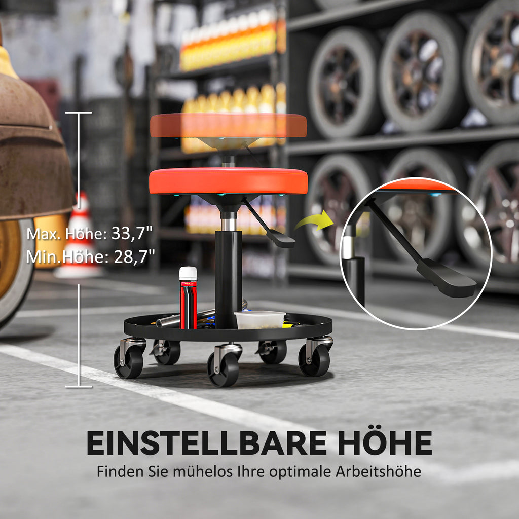 Entdecken Sie Ihren neuen Helfer in der Garage: den HOMCOM Werkstatthocker mit Rollen. Der Werkstattstuhl verfügt über einen stabilen Stahlrahmen, der bis zu 135 kg trägt, und eine höhenverstellbare pneumatische Funktion, die Ihre Knie bei ausgedehnten Arbeiten schont. Das kratzfeste Leder und das dicke, komfortable Kissen bieten Luxus pur. Zudem sorgt das integrierte Werkzeugfach dafür, dass Sie alles Wichtige stets zur Hand haben, während Sie mühelos auf 360°-Rollen navigieren.