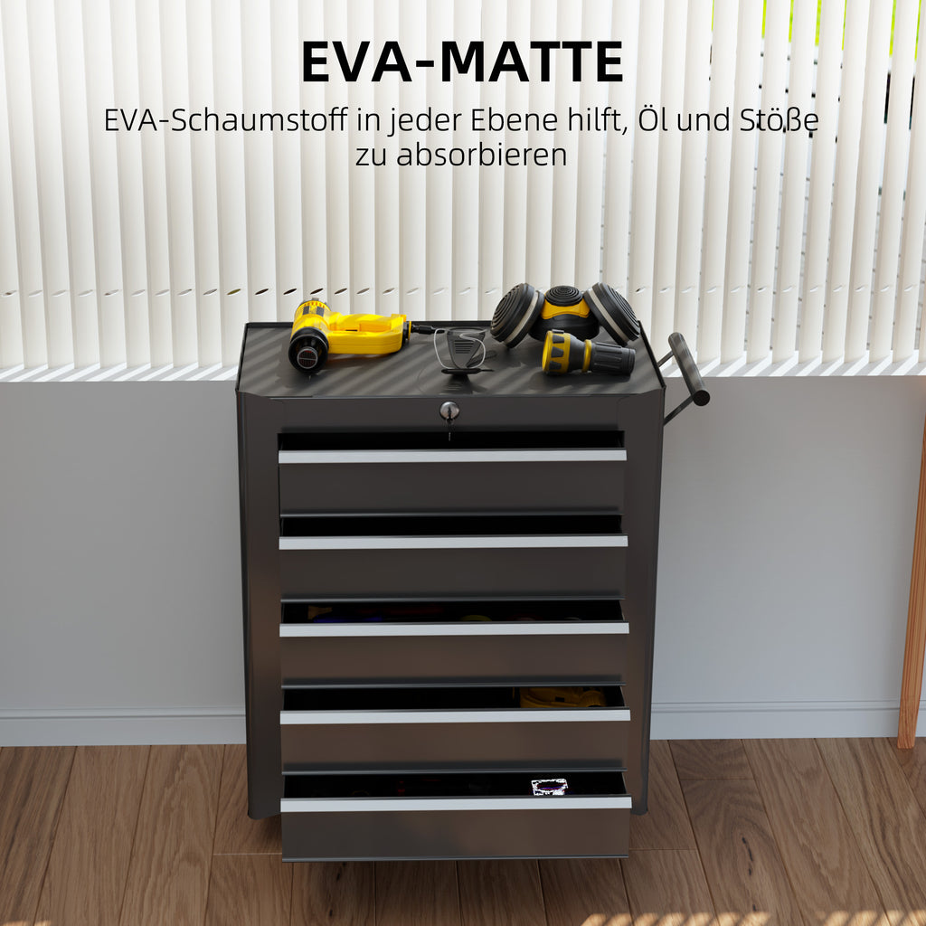 Entdecken Sie diese HOMCOM Werkzeugkiste, ideal zur sicheren Aufbewahrung Ihrer Fachausstattung. Mit fünf Schubladen, die reichlich organisierten Stauraum bieten, finden Sie notwendiges Werkzeug schnell. Eine obere Matte sichert zusätzlichen Ablageplatz. Aus pulverbeschichtetem Stahl gefertigt, gewährleistet ihre robuste Struktur dauerhafte Stabilität. Dank vier Rädern und einem seitlichen Griff lässt sie sich leicht verschieben. Mit Schloss und zwei Schlüsseln ausgestattet.
