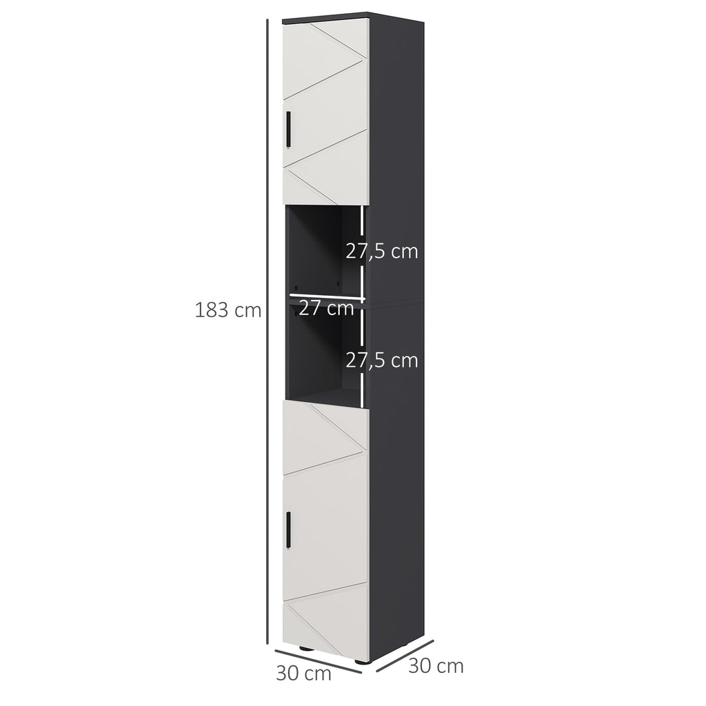Entdecken Sie mit HOMCOM subtilen Einfluss in Ihrem Raum. Dieser hohe, schlanke Badezimmerschrank in Dunkelgrau mit hellgrauen Türen, die durch geprägte Linien charakterisiert sind, bietet einzigartige Akzente für diese und kommende Saisons. Mit Ober- und Unterschrank sowie zwei Zwischenböden, bietet jeder Schrank ein dreifach verstellbares Innenregal für flexible Nutzung. Understatement mit minimalistischem Flair.