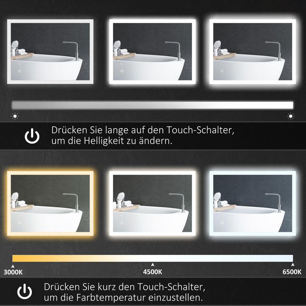 Machen Sie Ihre Beauty-Routinen mit diesem modernen LED-Badspiegel von kleankin zum wahren Vergnügen! Der Wandspiegel ist nicht nur praktisch, sondern auch ein absoluter Blickfang, der die Aufmerksamkeit Ihrer Gäste auf sich ziehen wird. Mit nur einer Berührung können Sie die Lichtintensität und Farbtemperatur anpassen und dank der praktischen Memory-Funktion immer wieder auf Ihre Lieblingseinstellungen zurückgreifen. Die große Spiegelfläche lässt Ihr Bad zudem noch größer und heller wirken.