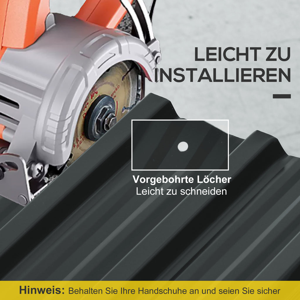 • Vorgebohrte Löcher, für einfache Montage: Legen Sie die Dachplatten einfach über den gewünschten Bereich und fixieren Sie diese mit den entsprechenden Schrauben. Einfach auf die benötigte Form zuschneidbar.
