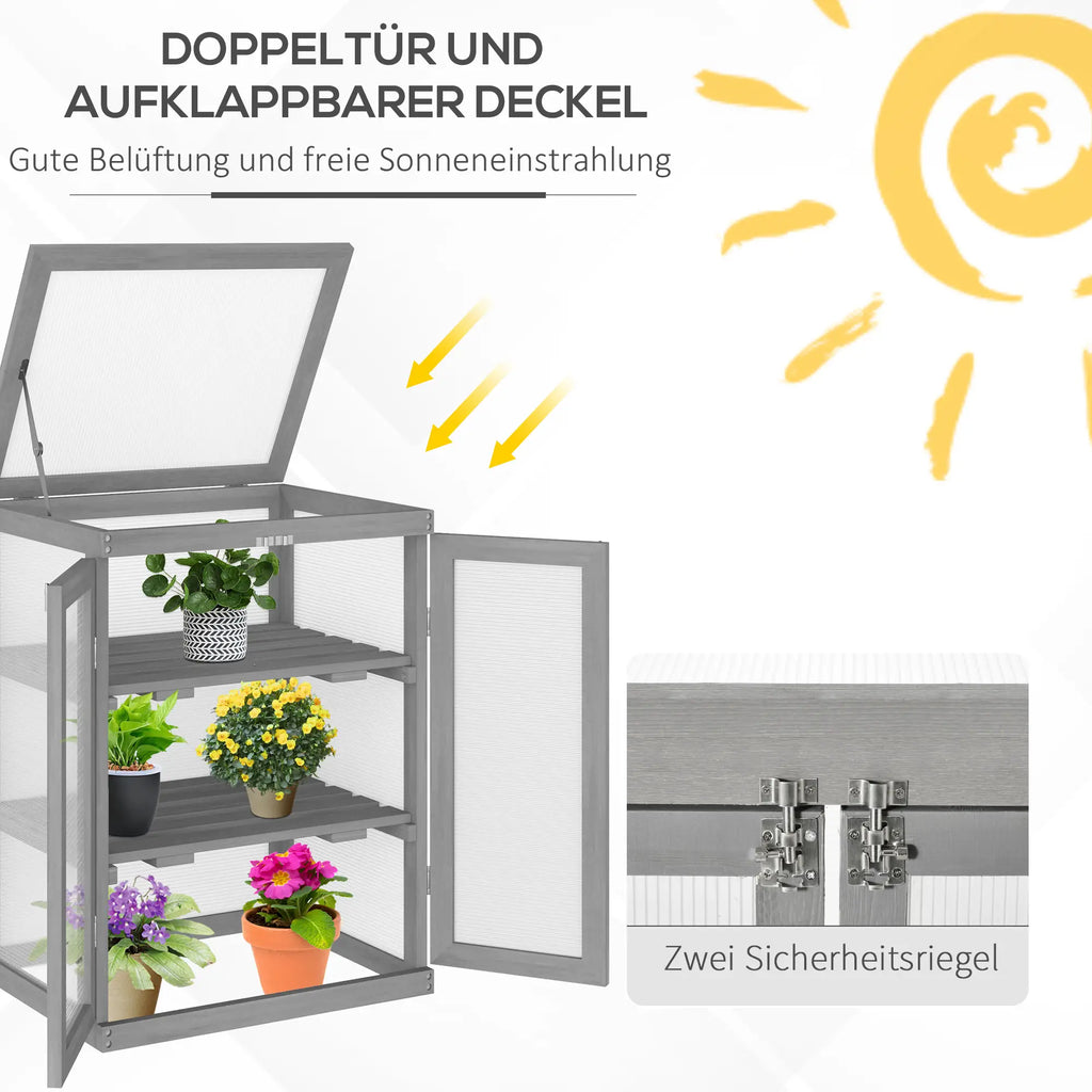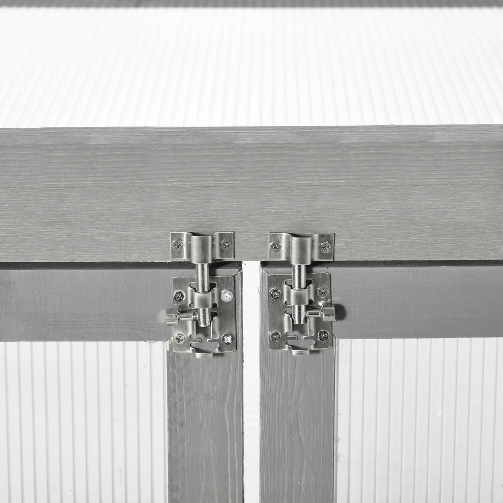 Ziehen Sie Ihren eigenen kleinen Garten mit Leichtigkeit in diesem handlichen und funktionalen Gewächshaus von Outsunny auf. Die transparenten und stabilen Polycarbonat-Wände ermöglichen energiereiches Sonnenlicht, um Ihre Pflanzen ungehindert zu erreichen, während die Wärme im Inneren des Gewächshauses eingeschlossen wird, um sie vor Kälte zu schützen. Das klappbare Dach und die geräumige Doppeltür machen die Pflege Ihrer Pflanzen besonders komfortabel.
