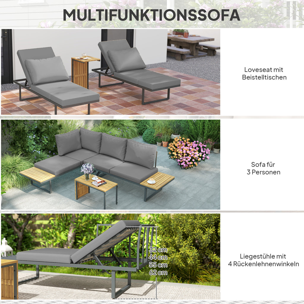 Genießen Sie entspannte Stunden mit diesem Holz-Gartenmöbel-Set, das aus robustem Stahl und Akazienholz gefertigt ist. Die Seitensitze der Sitzecke lassen sich leicht in bequeme Rückenlehnen mit vier einstellbaren Positionen umwandeln. Der Couchtisch ist multifunktional einsetzbar und jede Sitzbank verfügt über integrierte Seitentische für Getränke. Die kleinen Kissen können auch auf den Seitentisch gelegt werden, um die Eckbank in eine komfortable 3-Sitzer-Bank zu verwandeln.