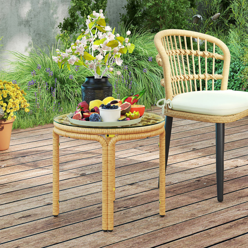 Outsunny Beistelltisch aus Polyrattan runder Couchtisch mit Glas Tischplatte Nachttisch Ø50 cm Gelb