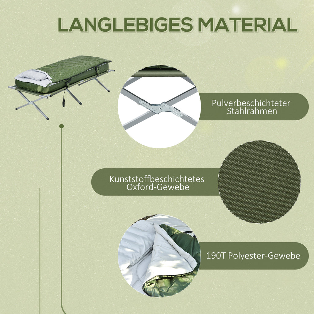 Mit dem Campingbett von Outsunny wird Ihr Outdoor-Erlebnis noch angenehmer. In diesem Campingbett-Set ist alles enthalten, was Sie brauchen: ein Campingbett, eine Matratze, einen Schlafsack, ein Kopfkissen, eine Luftpumpe und eine Tragetasche. Das bedeutet, dass Sie weniger Zeit mit dem Beziehen des Feldbetts verbringen müssen und mehr Zeit in der Natur genießen können. Mehr Zeit für Spaß und weniger Zeit für Vorbereitungen, denn das Feldbett-Set ist einfach aufzubauen.