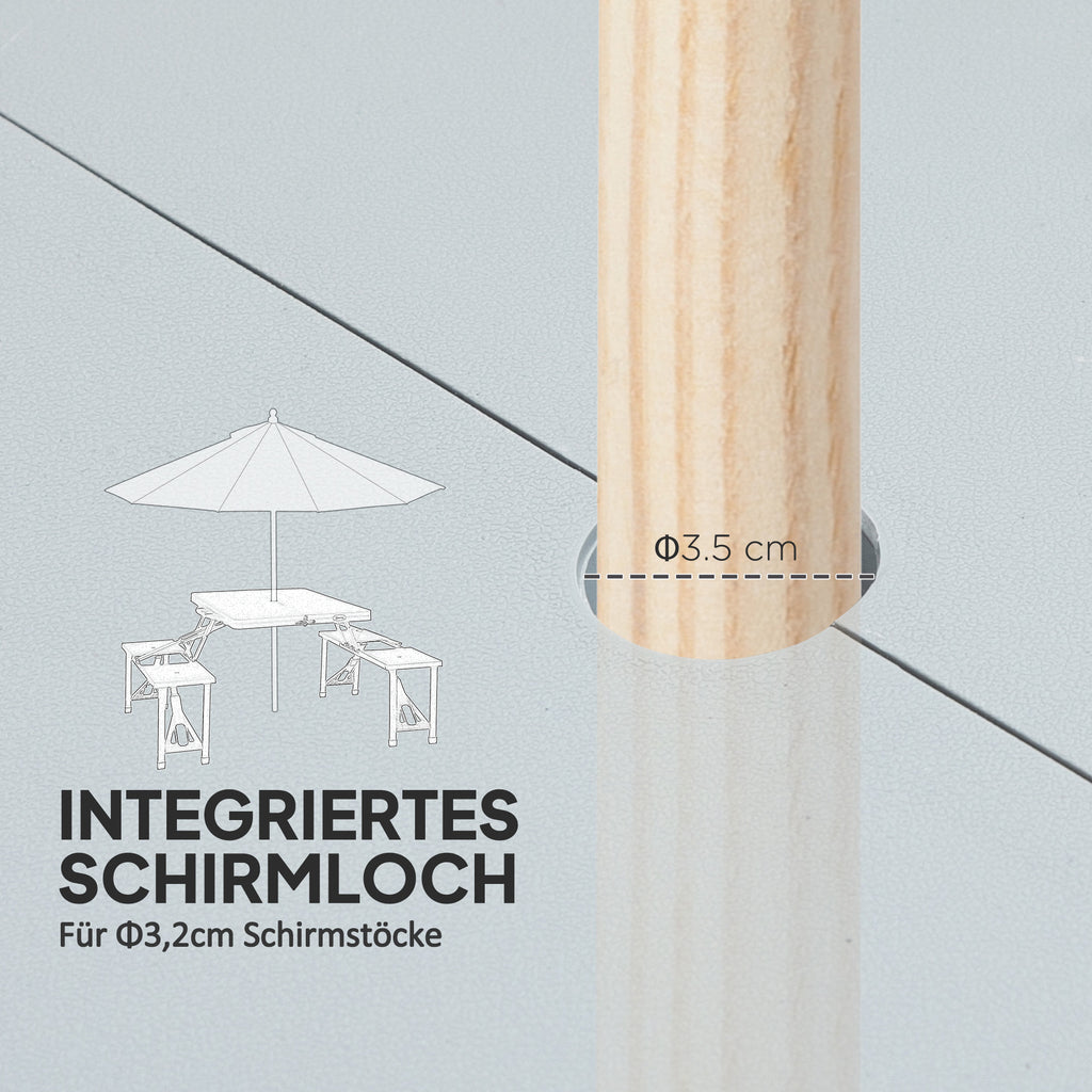 - In der Mitte des Campingtisches befindet sich eine Öffnung für einen Sonnenschirm mit einem Mastdurchmesser von Ø3,2 cm bis Ø2,5 cm