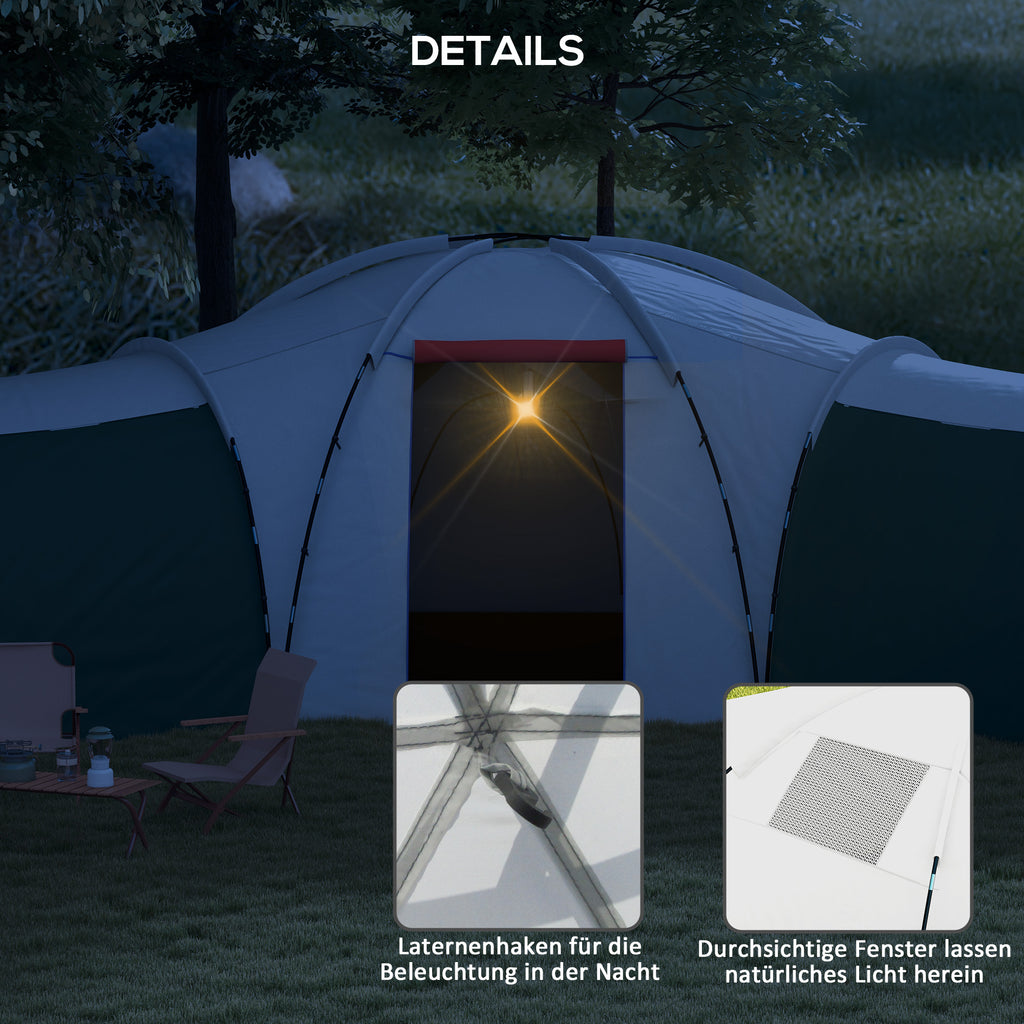 Erleben Sie unvergessliche Campingabenteuer mit Familie und Freunden in diesem geräumigen Tunnelzelt für 6-9 Personen von Outsunny. Dank der separaten "Wohn-" und "Schlafbereiche" bleibt Ihr Schlafplatz sauber und sichtgeschützt. Die ultraleichten Fiberglasstangen der Campingzelt sorgen für zuverlässige Stabilität. Alles lässt sich bequem in der mitgelieferten Tragetasche verstauen und transportieren. Genießen Sie ultimativem Outdoor-Komfort, egal wohin Sie das Abenteuer führt!