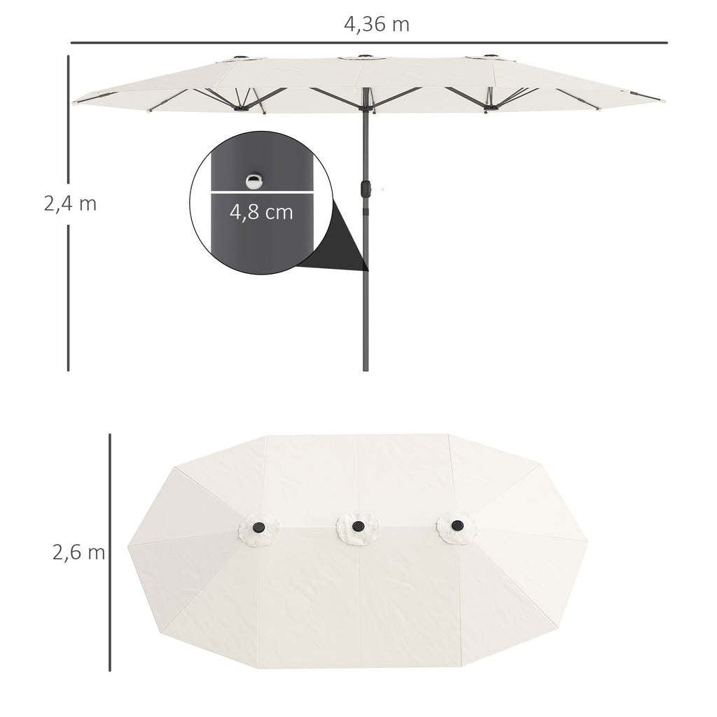 Erleben Sie weitreichenden Schatten mit dem Outsunny Doppelseitigen große Sonnenschirm. Dieser 4,4 m breite Doppelsonnenschirm garantiert mit seinem UPF30+ beschichteten Stoff Schutz und Kühle. Der pulverbeschichtete Stahlmast und die Fiberglasrippen des Doppelsonnenschirms sichern langanhaltende Stabilität, und die Kurbel erleichtert die Bedienung. Perfekt für jeden Garten!