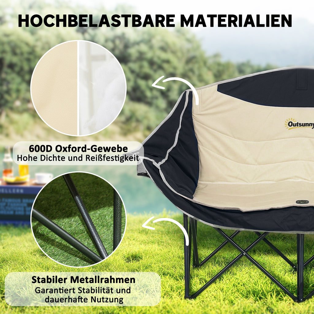 Erleben Sie Outdoor-Komfort mit dem Outsunny faltbare Campingstuhl! Der faltbare Angelstuhl bietet zwei gepolsterte Sitze mit Armlehnen und Getränkehaltern für mehr Raum und Entspannung. Aus strapazierfähigem 210g/m² 600D Oxford-Gewebe und einem stabilen Metallgestell gefertigt, ist dieser klappbare Campingstuhl ideal für Strand, Garten oder Camping.