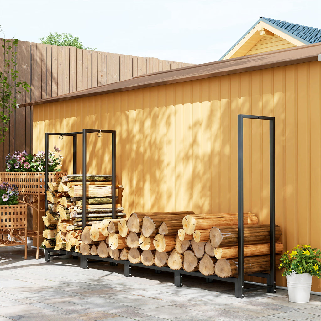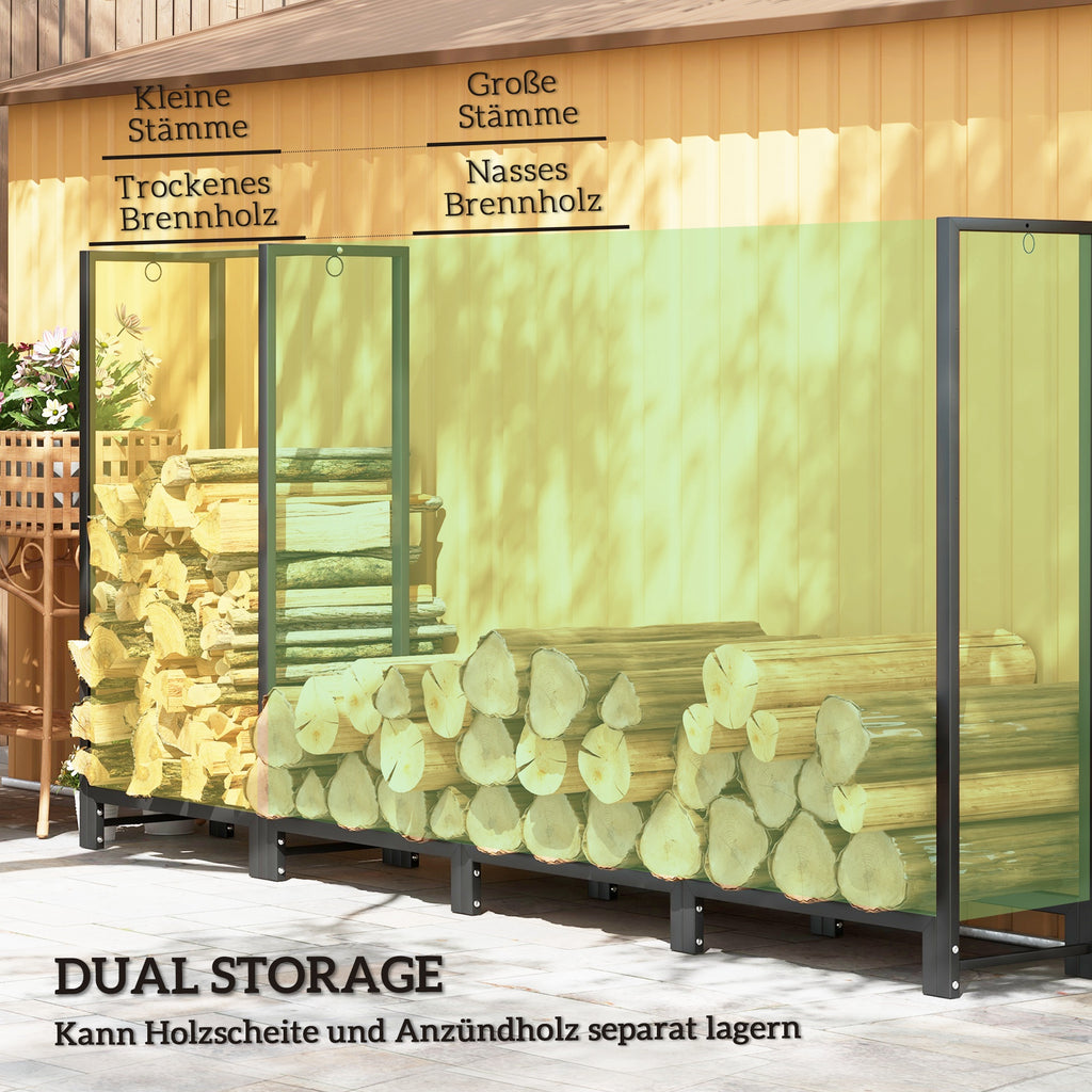 Organisieren und schützen Sie Ihr Brennholz stilvoll mit dem Outsunny Brennholzregal! Es verfügt über ein innovatives Design mit zwei Bereichen, um kleinere und größere Holzscheite sowie Anzündholz zu trennen. Der robuste Rahmen des Kaminholzregals aus pulverbeschichtetem Stahl kann bis zu 300 kg tragen. Drei Sicherheitsringe und zehn stabile Beine des Kaminholzregals verhindern das Kippen, während die erhöhte Basis das Holz trocken hält und zum Anfeuern bereit ist.