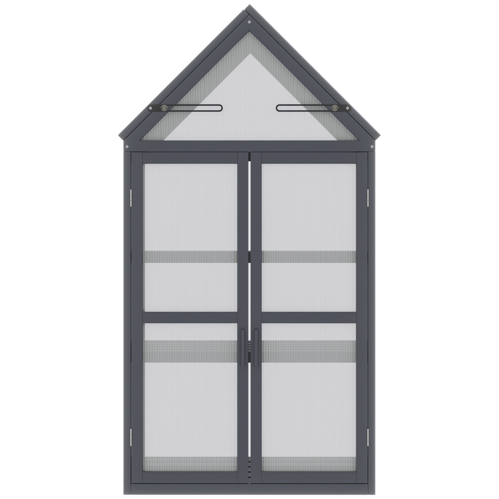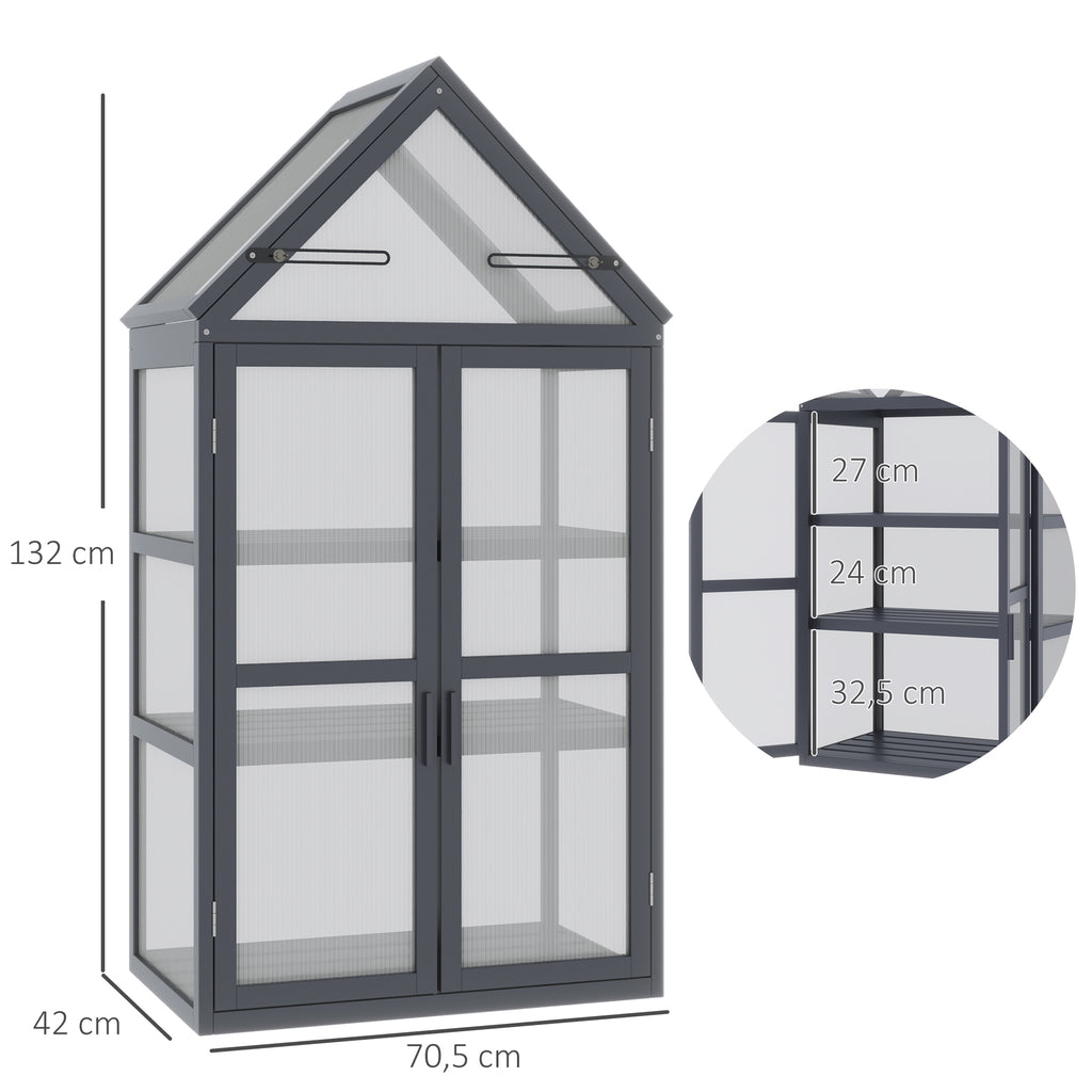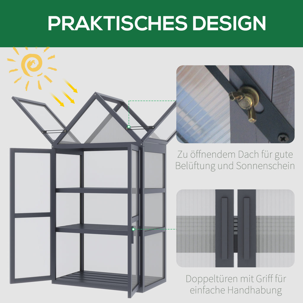 Mit diesem kompakten Gewächshaus von Outsunny können Sie fast überall Blumen, Kräuter und beliebige Gewächse hochziehen. Es besteht aus einem stabilen Holzrahmen und ist mit einem festen Gehäuse aus transparenten Polycarbonatplatten ausgestattet, sodass Ihre Pflanzen viel Sonnenlicht erhalten und bei konstanter, gesunder Wärme wachsen. Drei praktische Regalböden bieten genug Raum für zahlreiche Gewächse und zwei aufklappbare Dachfenster und eine Doppeltür sorgen für eine hervorragende Belüftung.
