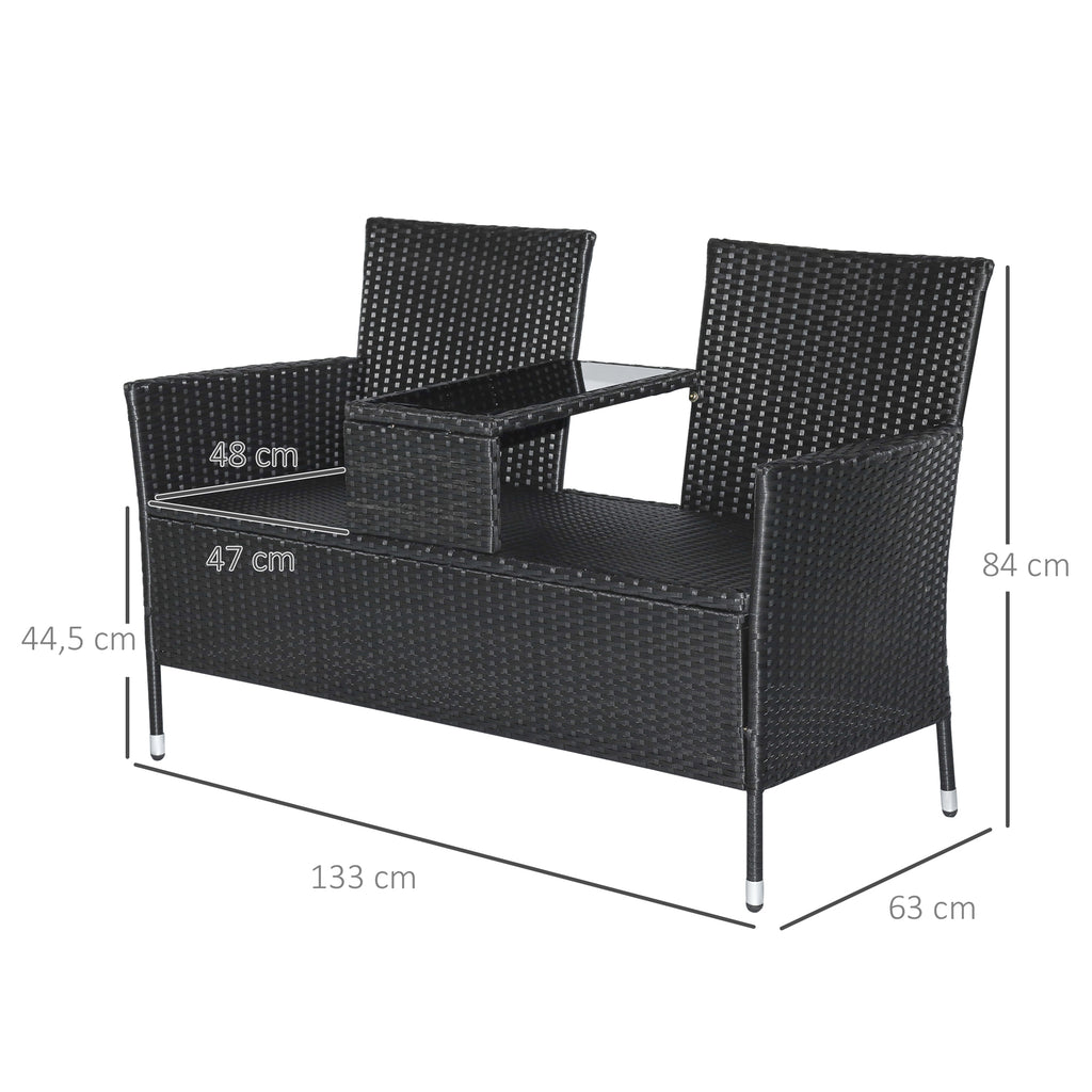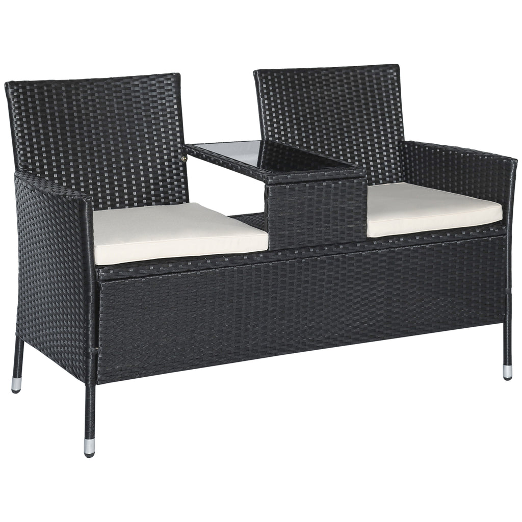 Wenn Sie sich eine bequeme Sitzmöglichkeit samt Ablagefläche zur Entspannung im Garten oder auf der Terrasse wünschen, werden Sie mit unserer bequemen 2-Sitzer Gartenbank von Outsunny bei uns fündig. Unsere 2-Sitzer Gartenbank ist wegen des wasser- und schmutzabweisenden, UV-beständigen Polyrattan-Geflecht optimal für den Einsatz im Außenbereich geeignet. Damit Sie darauf gemütlich sitzen, sind zwei weich gepolsterte Sitzkissen mit abnehmbaren Bezügen mitgeliefert. Auf dem integreirten Tisch finden Ihre Tassen, Gläser oder andere Gegenstände ihren Platz.