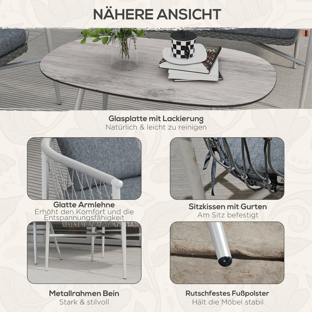 Mit diesem vierteiligen Rattan-Gartenmöbel-Set von Outsunny gewinnen Sie eine stabile und gleichermaßen dekorative Sitzgruppe mit einem pulverbeschichteten Stahlrahmen und einer robusten Verkleidung aus hochwertigem Kunstrattan. Die Sessel mit Schaukelfunktion sind ausgesprochen komfortabel - perfekt, um den Alltag sanft ausklingen zu lassen. Genießen Sie die frische Luft mit Familie und Freunden mit unserem Balkonmöbel Set, während Sie Gesellschaftsspiele spielen oder ein Getränk genießen.