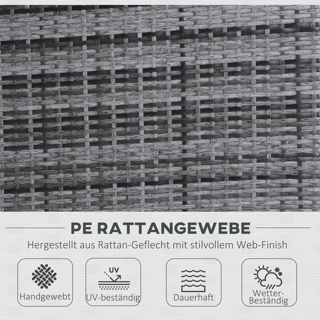 Diese chice Polyrattan-Sofagarnitur von Outsunny bietet Ihnen den perfekten Entspannungsort für die wärmeren Tage. Das dreiteilige Set zeichnet sich durch modernes Design und hochwertige Verarbeitung aus. Stabilität verleiht Ihrer Sitzgruppe das starke, rostfreie Metallgestell. Darüber schmiegt sich das hochwertige, robuste Kunstrattan. Die moderne Kunstfaser überzeugt vor allem durch ihre Witterungsbeständigkeit. Besonders bequem: die dick gepolsterten Sitz- und Rückenkissen.