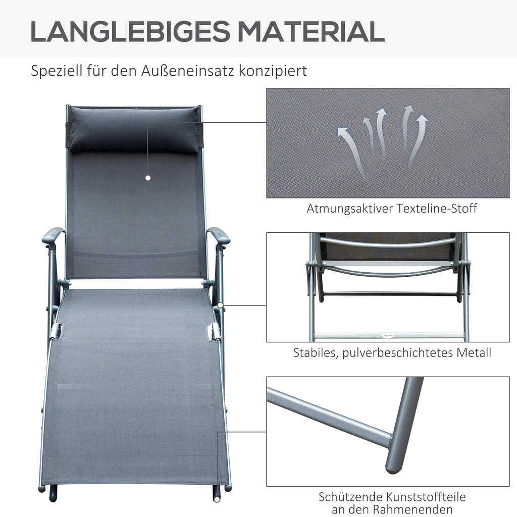 Machen Sie es sich bequem auf dieser stabilen Sonnenliege in erstklassiger Qualität! Die Neigung der Rückenlehne ist in fünf Stufen verstellbar, sodass Sie sich flexibel in der Liege- oder Sitzposition oder dazwischen ausruhen können. Für zusätzlichen Komfort sorgen der Sitzbezug aus luftdurchlässigem Textilene-Stoff sowie das mitgelieferte Kissen. Bei Nichtgebrauch ist die Sonnenliege platzsparend klappbar und kann bequem verstaut werden.