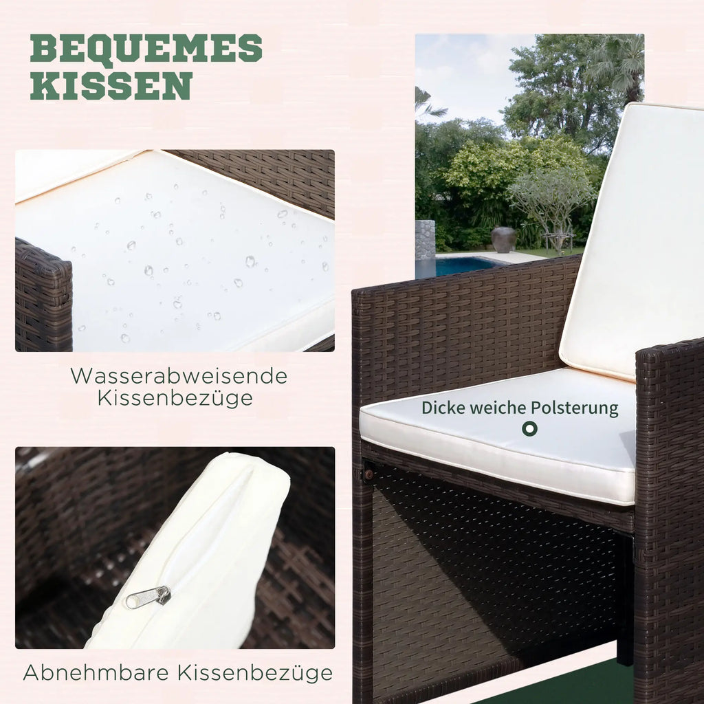 Wer gemütlich in der Frischluft zusammensitzen will, kommt nicht an unserer Polyrattan Sitzgruppe von Outsunny vorbei. Ihr Set setzt sich insgesamt aus 21 Teilen zusammen und bietet Platz für die gesamte Familie. Diese Sitzgruppe ist nicht nur optisch ein echter Hingucker, sondern ein langlebiger Begleiter fürs gemeinsame Stunden im Grünen. Bei Nichtgebrauch lassen sich die Stühle und Hocker platzsparend und ordentlich unter den Tisch schieben.
