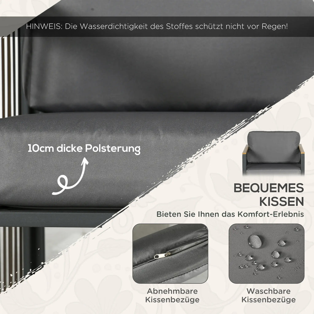 Dieses 3-teilige Rattan-Gartenmöbelset von Outsunny ist ein dekoratives Highlight! Der Metallrahmen, umhüllt von hochwertigem PE-Rattan, gewährleistet eine dauerhafte Haltbarkeit. Mit 10 cm dicken Sitzkissen für zusätzlichen Komfort, Holzdekor an den Armlehnen der Stühle und am Couchtisch für eine geschmackvoll natürliche Note. Das Outsunny 3-teilige Gartenset ist unverzichtbar für jeden Garten oder Terrassenbereich und vervollständigt Ihren Außenbereich durch Komfort und Stil.