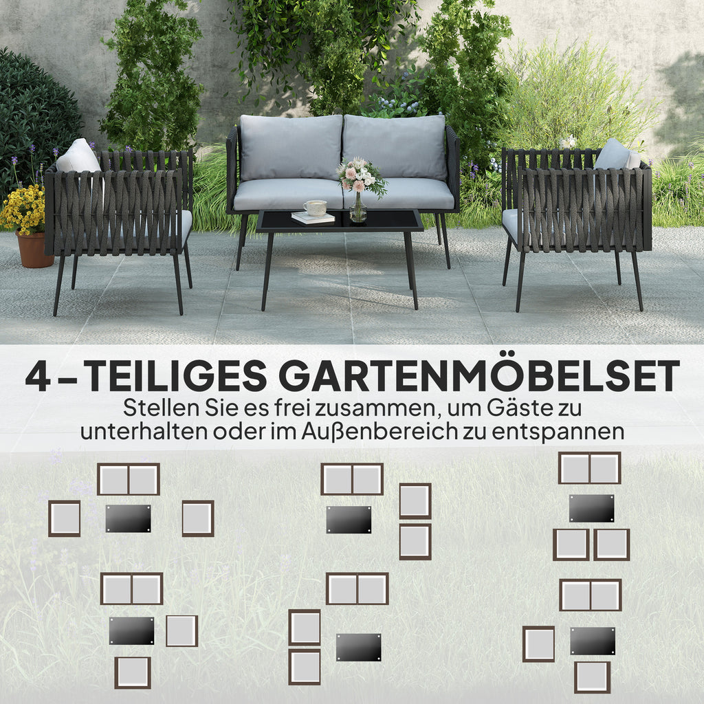 Verwandeln Sie Ihren Garten mit den Outsunny Gartensitzloungen in eine einladende Oase. Dieses Balkonmöbel-Set aus vier Teilen, inklusive eines Loveseats, zwei Armlehnstühlen und einem Kaffeetisch, bietet mit seinen abnehmbaren und waschbaren Polstern hohen Komfort. Der Couchtisch mit einer Oberfläche aus gehärtetem Glas verleiht Eleganz und ist eine modische Bereicherung für jedes Patio-Set. Die kunstvoll gewebten Armlehnen der Balkonsitzgruppe harmonieren perfekt mit jedem Außenambiente.