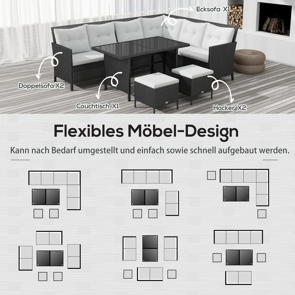 - Material: Polyrattan, Metall, 180g/m² Polyester, Sicherheitsglas