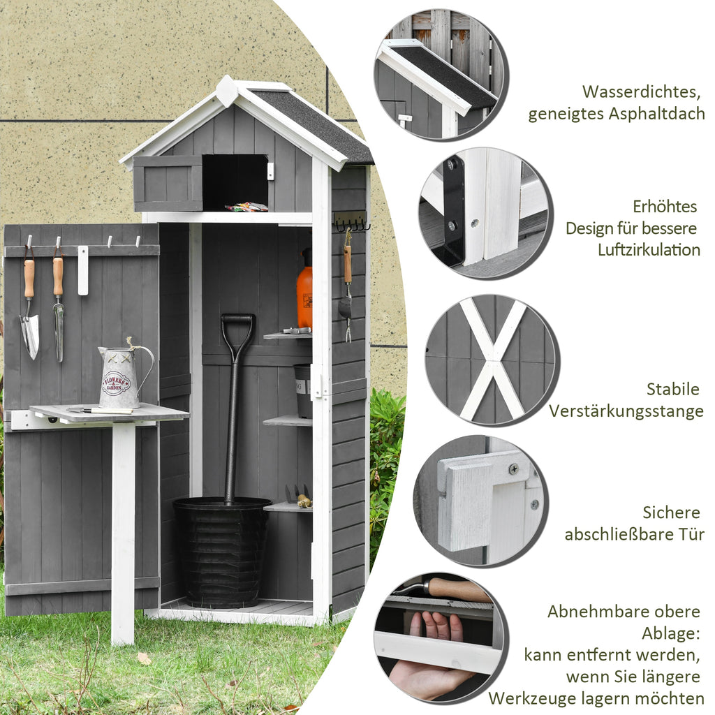 Dieses Gerätehaus von Outsunny hält ihr Gartenwerkzeug griffbereit und organisiert. Ein integrierter Klapptisch dient als Ablage oder Pflanztisch. Zusätzliche Haken und ein verstellbares Regal bieten viel Stauraum für Werkzeug und Gartenzubehör. Die solide Konstruktion besteht aus lackiertem Tannenholz. Das schräg zulaufende Dach verhindert Wasseransammlungen und hält ihr Werkzeug trocken. Dieses Gerätehaus von Outsunny ist der ideale Aufbewahrungsort für Gartenzubehör.