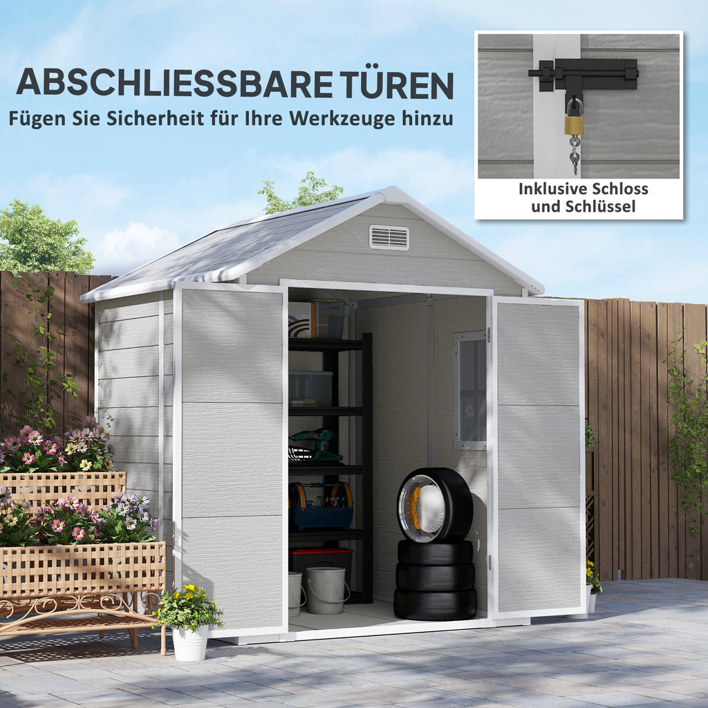 Entdecken Sie den Outsunny Gartenschuppen aus Kunststoff, das Eleganz mit Praktikabilität verbindet. Mit Abmessungen von 182 x 151 x 219 cm bietet dieser Fahrradschuppen einen großzügigen Innenraum von 162 x 131 cm, umhüllt von 12 mm starkem, holzartigen Polypropylenharz, das sowohl wasserdicht als auch UV-beständig ist. Ein klares Fenster des Gartengerätehauses sorgt für natürliches Licht und zwei Lüftungsöffnungen garantieren, dass Ihre Gegenstände trocken und frisch bleiben.