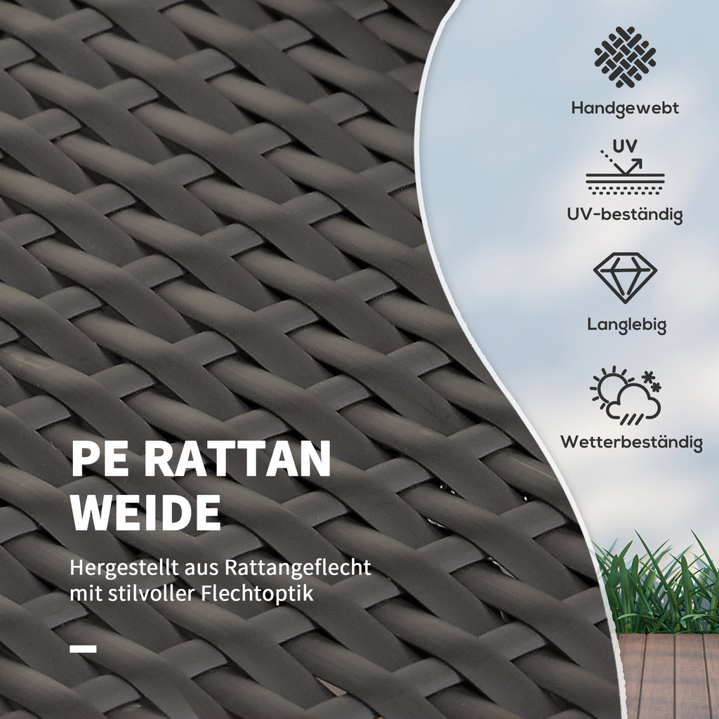 Unser vielseitiges Gartensofa-Set von Outsunny bietet einen gemütlichen Rückzugsort zum Schlafen und Entspannen. Das Set umfasst ein Doppelsofa und eine ausfahrbare Fußbank mit Kissen. Durch die verstellbare Rückenlehne wird das Sofa zum Outdoor-Bett für zwei Personen. Das robuste Metallgestell und das wetterfeste Kunstrattan bieten hohe Stabilität und Langlebigkeit. Dank des cleveren, klappbaren Designs eignet sich dieses Sofa ideal für gemütliche Stunden im Garten oder auf der Terrasse.
